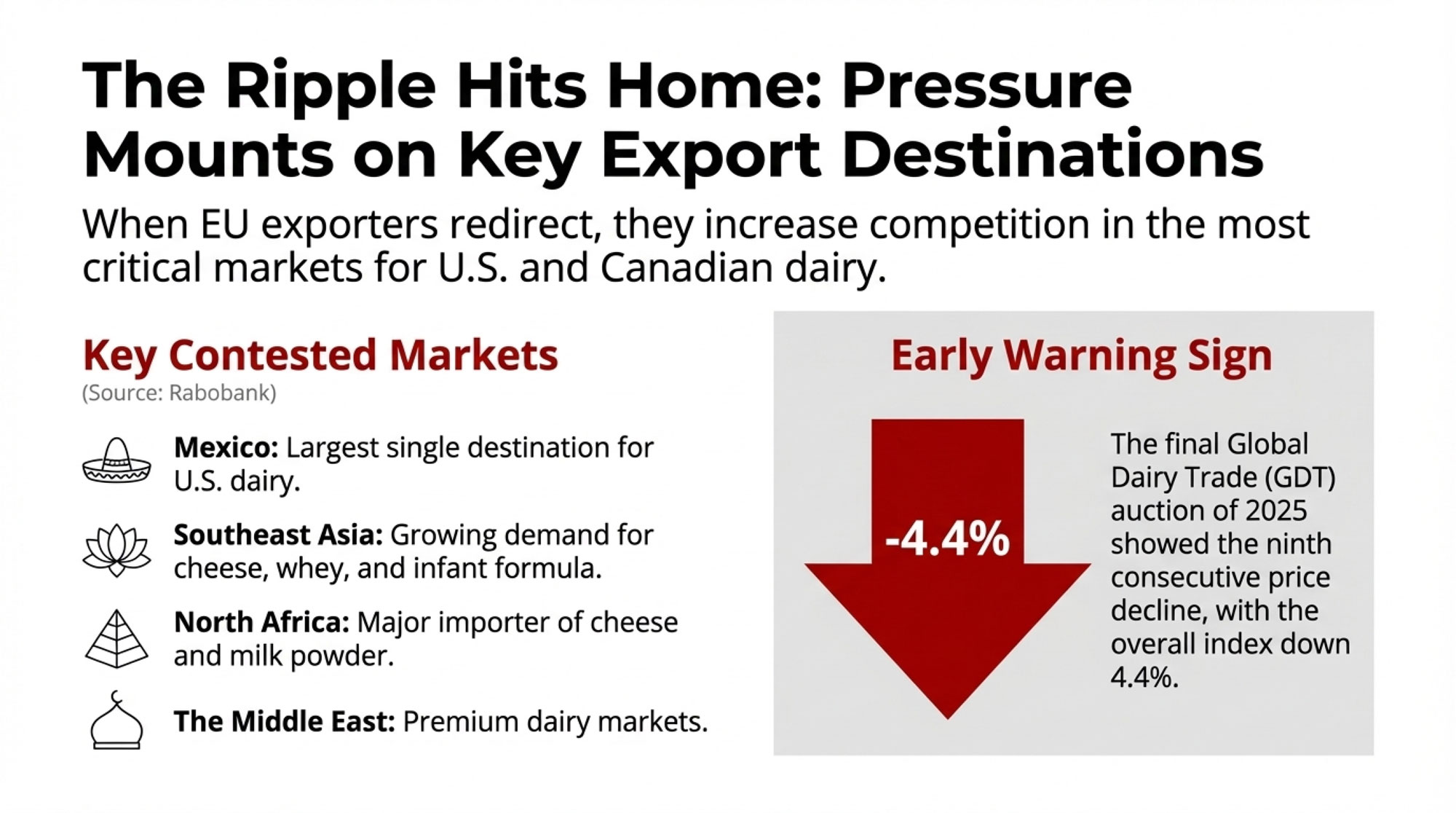 - North American dairy feels this indirectly but meaningfully: Displaced EU production will compete harder in Mexico, North Africa, and Southeast Asia. Those are your export markets, too.