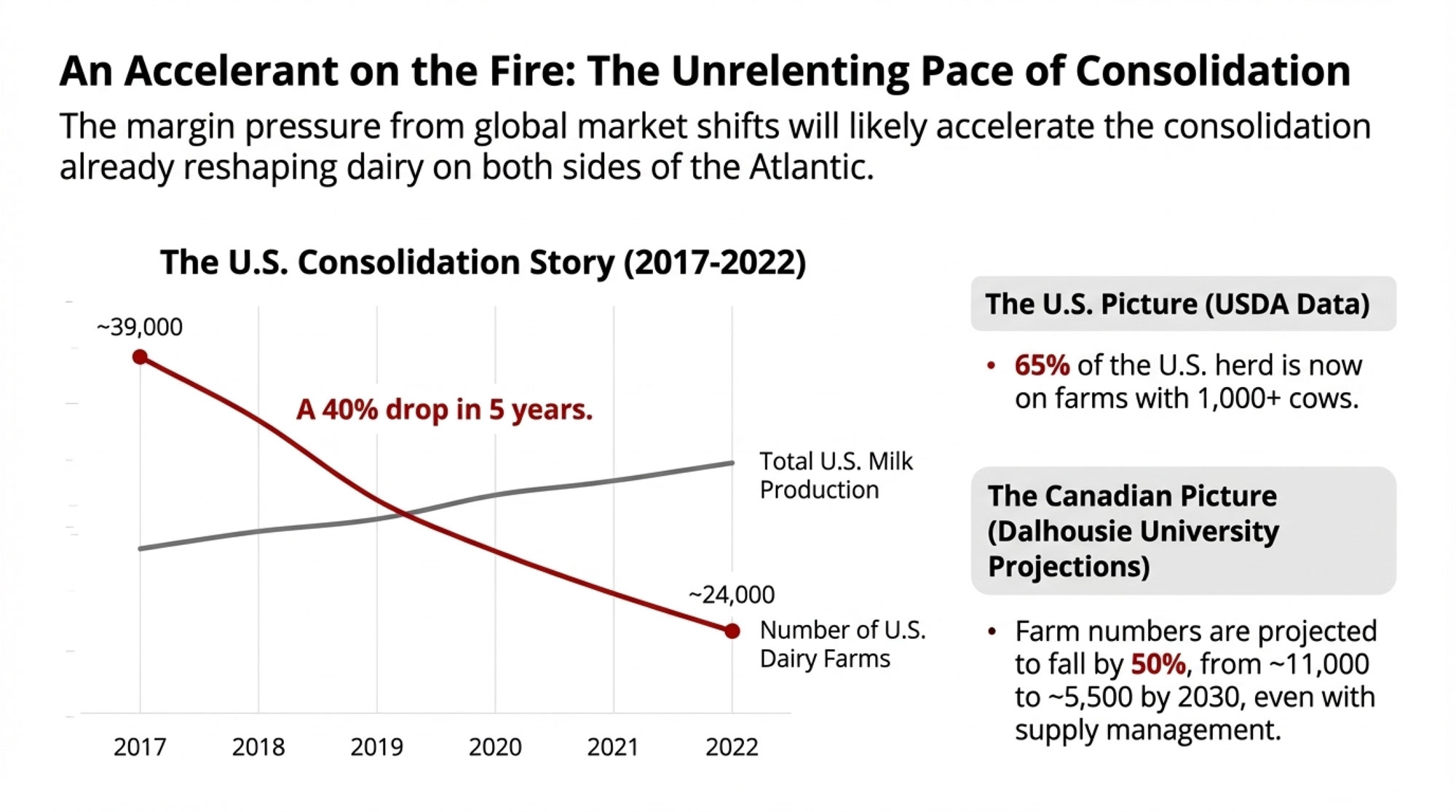 Canada’s supply management system provides some insulation but hasn’t prevented domestic consolidation. Research from Dalhousie University’s Agri-Food Analytics Lab, led by Dr. Sylvain Charlebois, projects that Canadian dairy farm numbers will decline from approximately 11,000 today to around 5,500 by 2030—a 50% reduction, even under supply management.