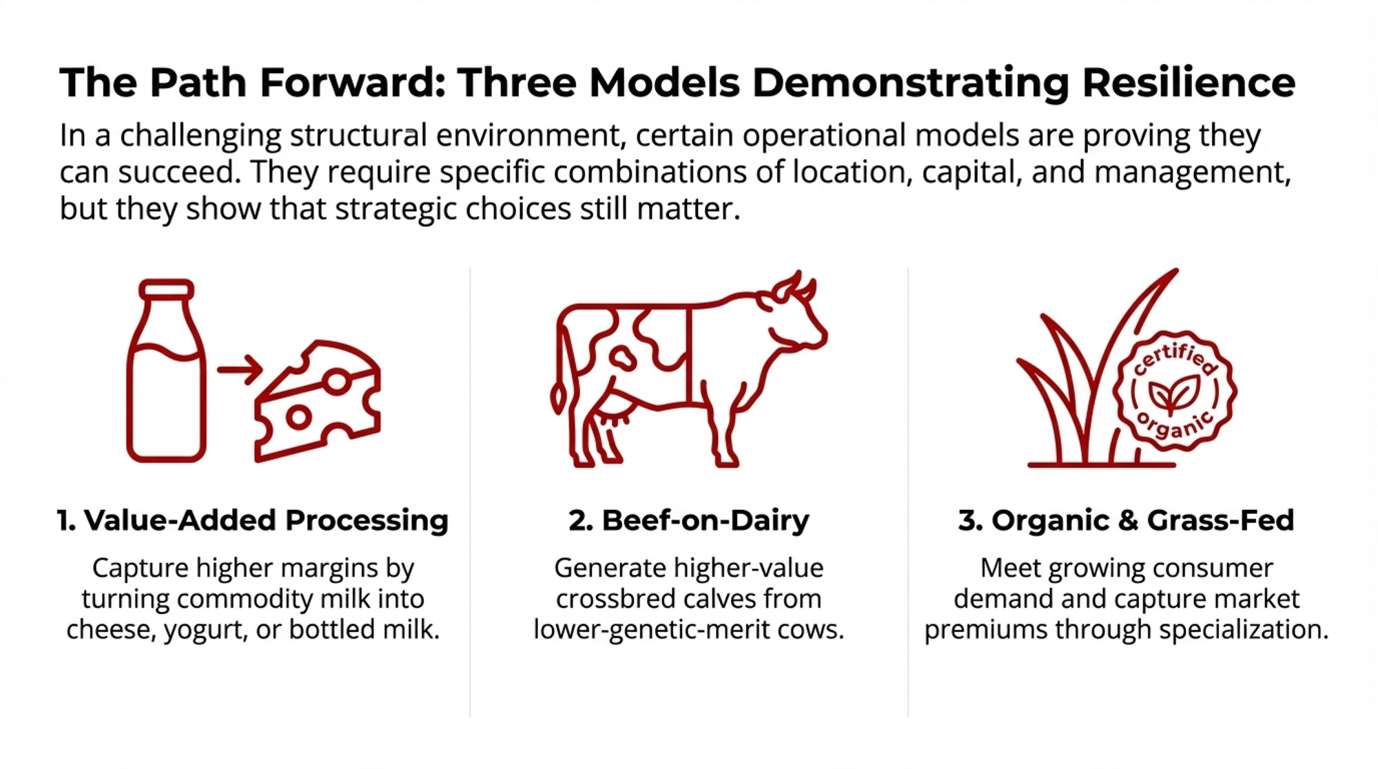 For all dairy operations: The structural consolidation trend continues. Operations in the 200-700 cow range face particularly complex economics under sustained margin pressure. Strategic decisions made in the next 18-24 months—whether toward scale, toward differentiation, or toward well-planned transition—will shape outcomes for the coming decade.