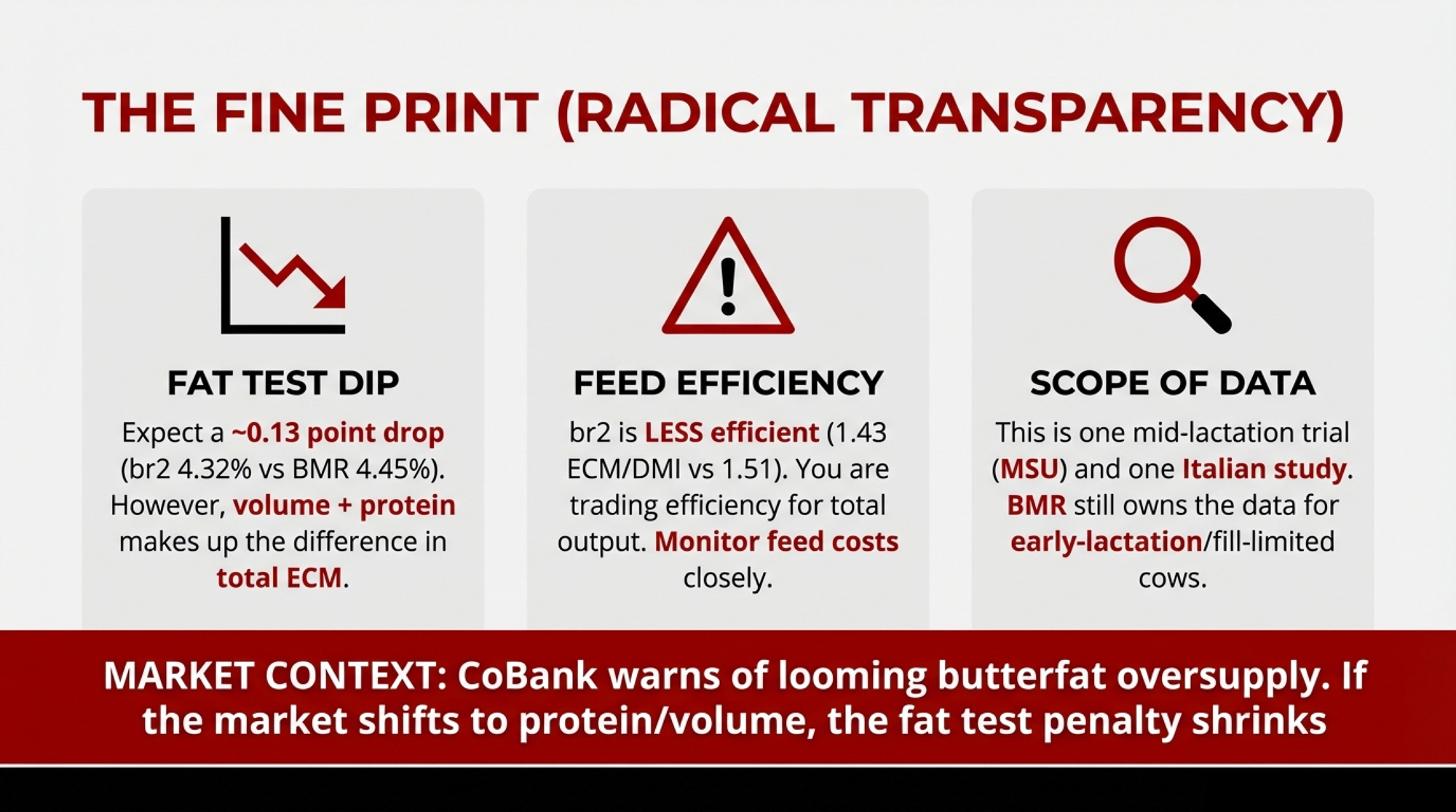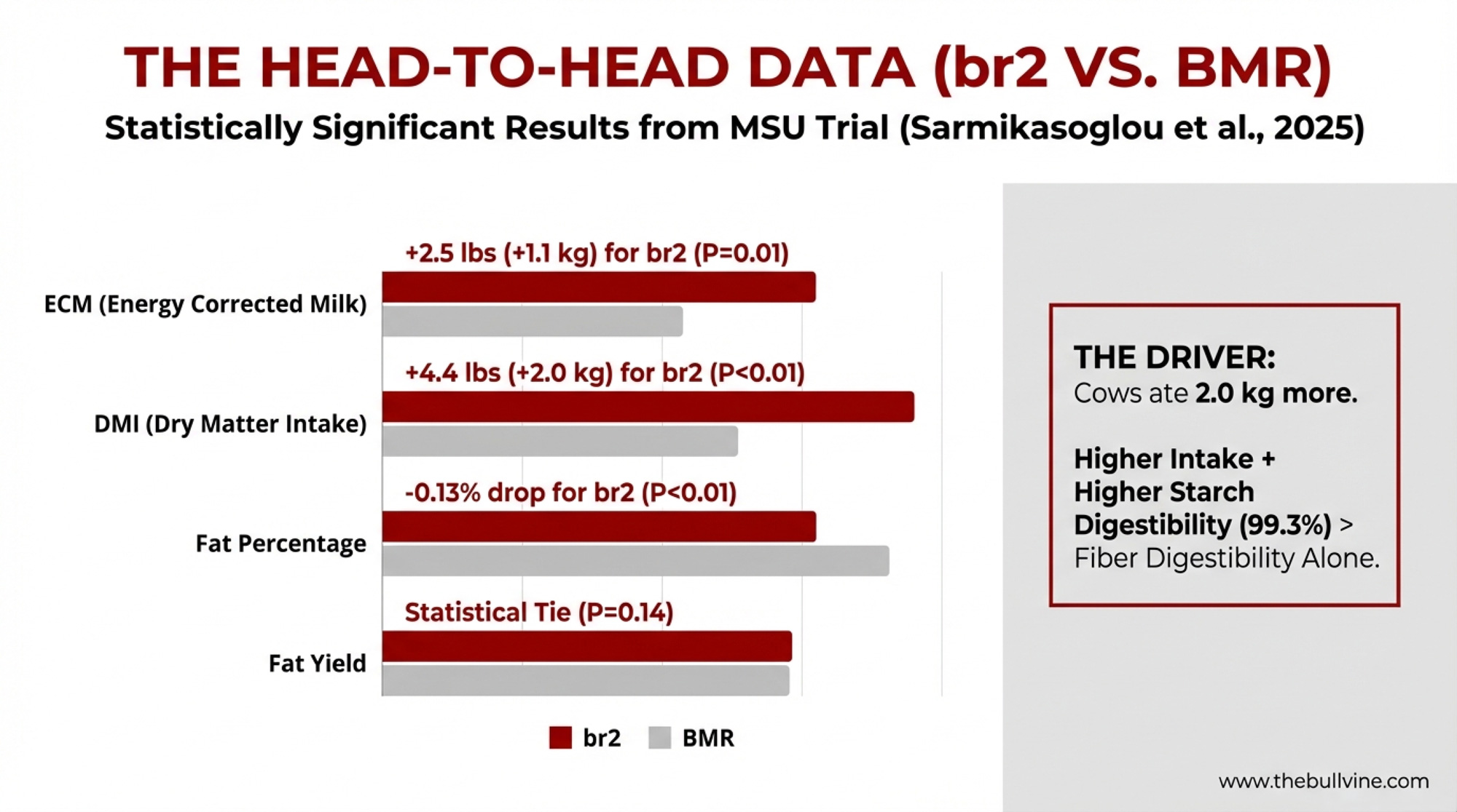 br2 beat BMR on production at the cost of lower feed efficiency and a lower fat test. If your market pays hard on fat percentage, that 0.13-point drop versus BMR isn’t a footnote — it’s a spreadsheet conversation.