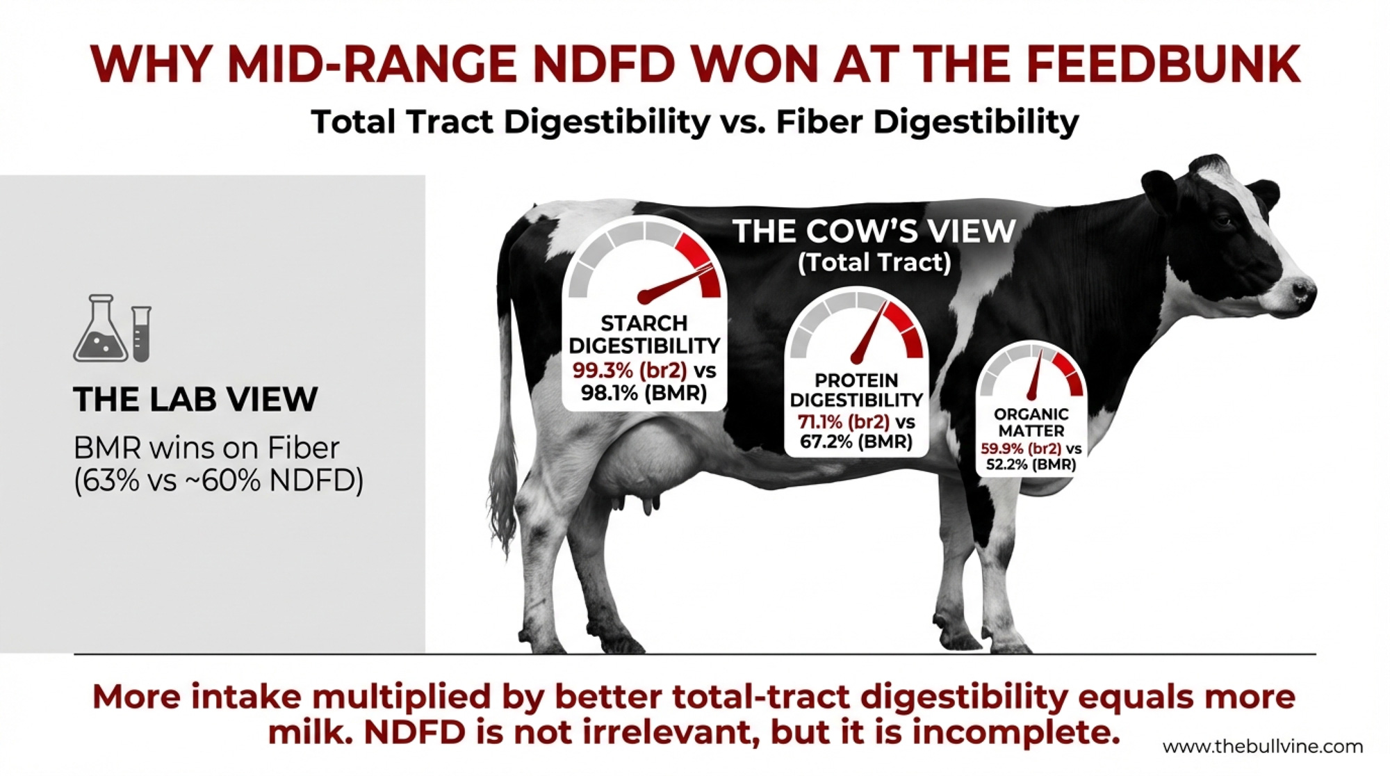 BMR’s fiber was more digestible in the test tube. But in the cow — where OM, starch, and protein digestibility all contribute to energy supply — br2 captured more total nutrients. And the cows ate 2.0 kg/d more of it than BMR.