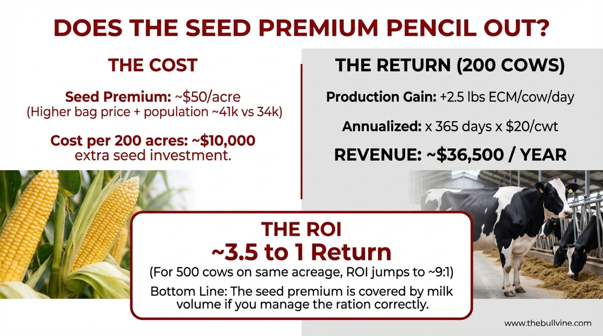 Executive Summary: Michigan State’s first short‑stature br2 feeding trial put three br2 hybrids head‑to‑head with a tall conventional and a Pioneer BMR — and the br2 silage shipped 2.5 lb more ECM per cow per day than BMR in mid‑lactation Holsteins. On paper, BMR still owned the NDFD column, but cows on br2 ate about 2 kg more dry matter and pulled more energy out of organic matter, starch, and protein, so total‑tract digestibility and milk moved their way. Fat test slipped roughly 0.13 points versus BMR while fat pounds stayed similar, which looks a lot less scary once you know CoBank is already warning about butterfat oversupply and cheesemakers chasing a tighter protein‑to‑fat ratio. When you turn it into barn math, that ~2.5 lb ECM bump pencils out to roughly $36,500 a year on 200 cows (and north of $90,000 on 500) at a $20/cwt pay price, against about $50/acre more in seed cost from higher-priced bags and higher plant populations. br2 also brings standability and optionality BMR can’t — similar or better DM yield than tall corn, less lodging risk in storms, and the option to shell it for grain if the milk‑to‑corn ratio flips, instead of being stuck chopping every acre. The fine print: feed efficiency was lower on br2, BMR still has the best data in very early lactation, and we’re talking about one Michigan trial plus an Italian study that only tested brachytic against tall corn, so this is strong first evidence, not a universal law yet. For 2026, the smart move is to trial br2 on a slice of your silage acres, budget the seed premium up front, and sit down with your nutritionist so higher forage intake actually replaces purchased energy instead of just giving you a bigger feed bill for the same milk.