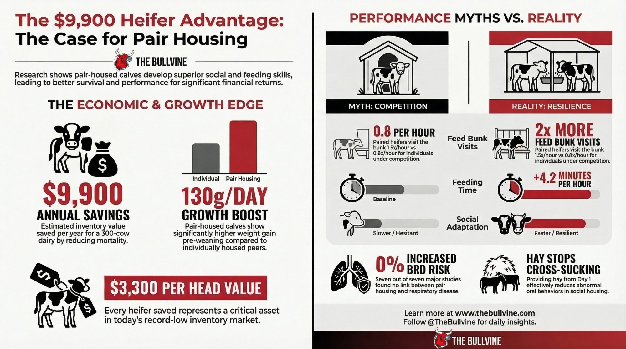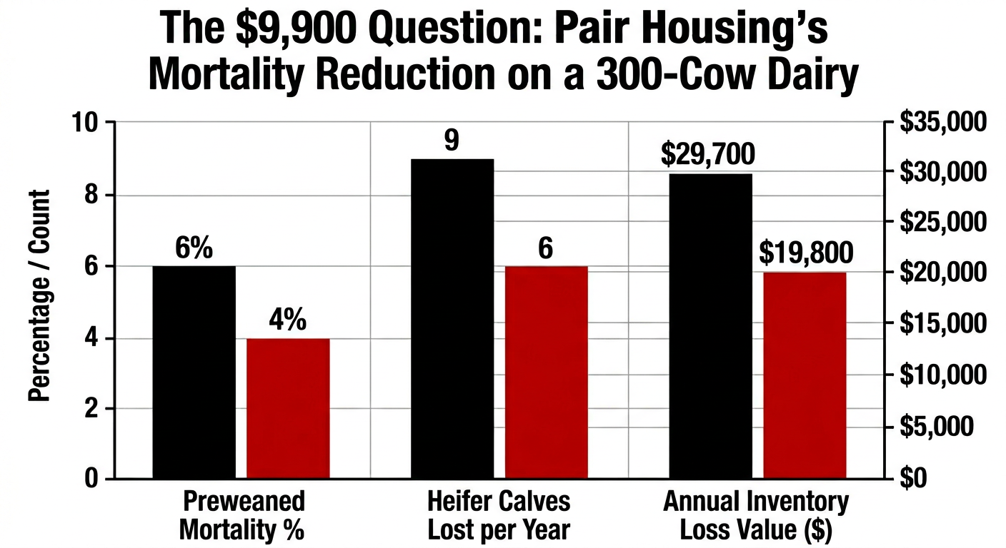 - If your preweaned heifer mortality exceeds 5%, pair housing is one of the lowest-cost interventions available — the research shows equal or better health outcomes, and every percentage point of mortality reduction is worth roughly $4,950/year on a 300-cow dairy at the current national average heifer price.