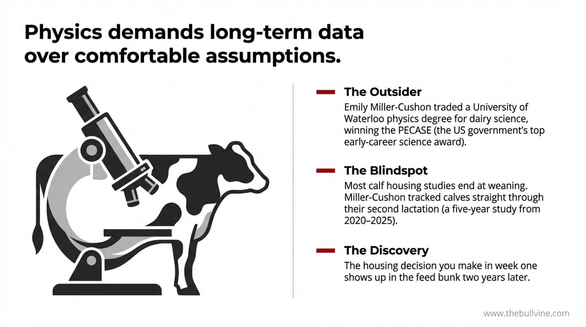 The dairy industry has a history of breakthroughs that came from outside the usual channels. Robert Chicoine showed what one unconventional thinker could do with a bull nobody else wanted. Miller-Cushon is showing what a physicist’s training does when you point it at a calf barn — and the data says it changes outcomes your heifers carry for life.