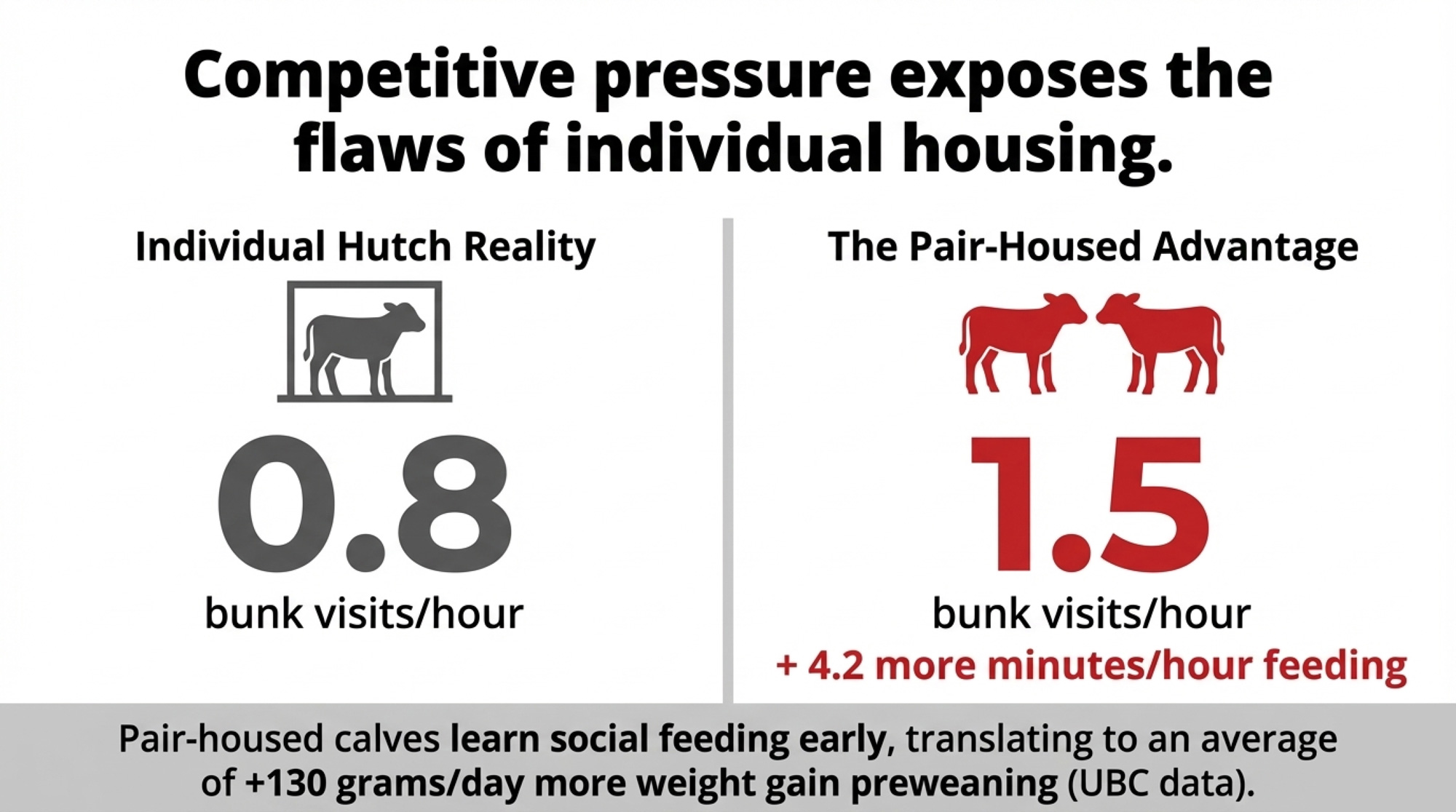 Research from the University of British Columbia, published in 2023, found pair-housed calves averaged 130 grams per day more weight gain than individually housed calves — a finding consistent across multiple Canadian studies. At UF, Miller-Cushon’s own 2025 study (n=100 pens, 50 individual vs. 50 paired) showed clear performance benefits from pair housing from birth, with advantages particularly strong during cooler months.
