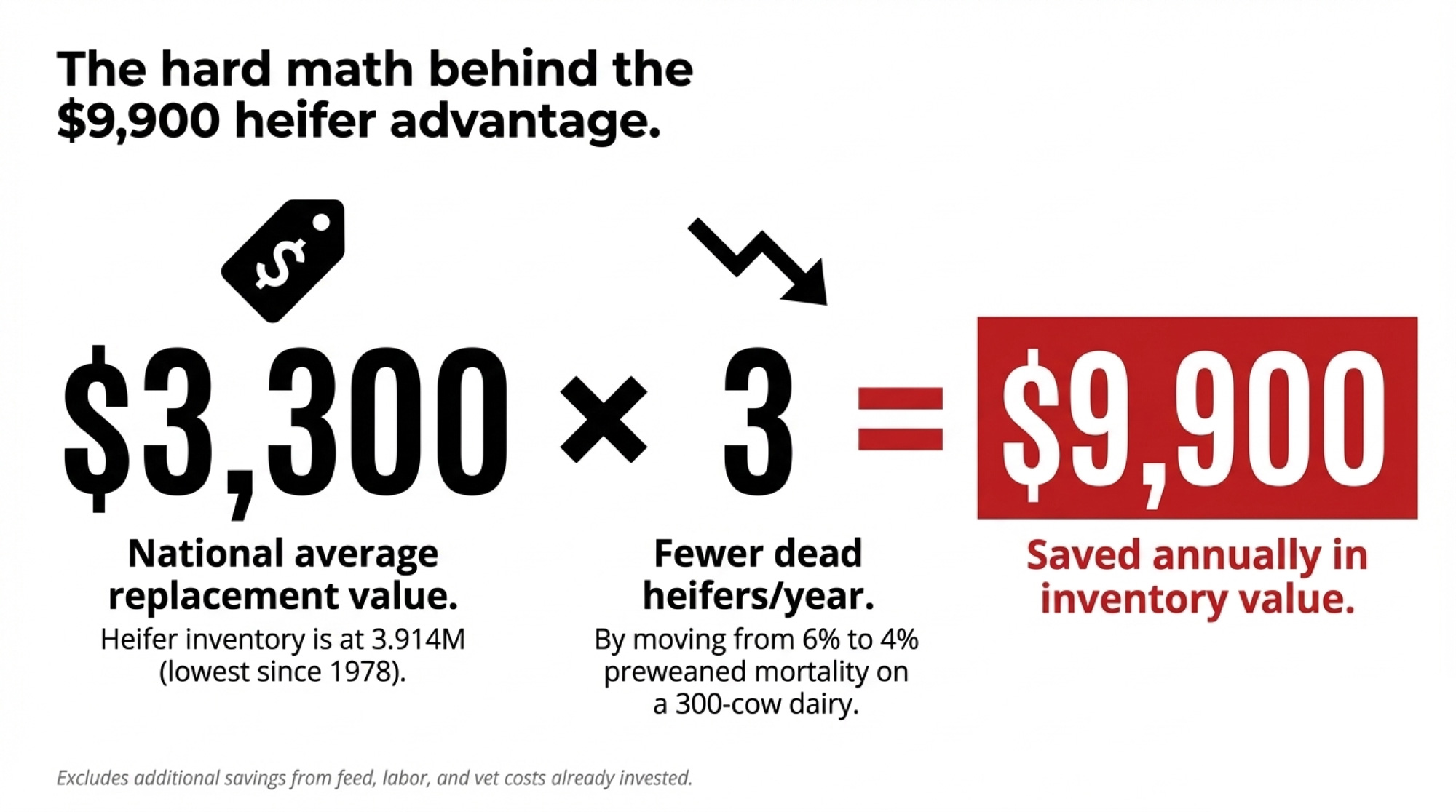 At $3,300 per replacement heifer (near the national average), that’s roughly $9,900 in annual saved inventory value on a 300-cow dairy.