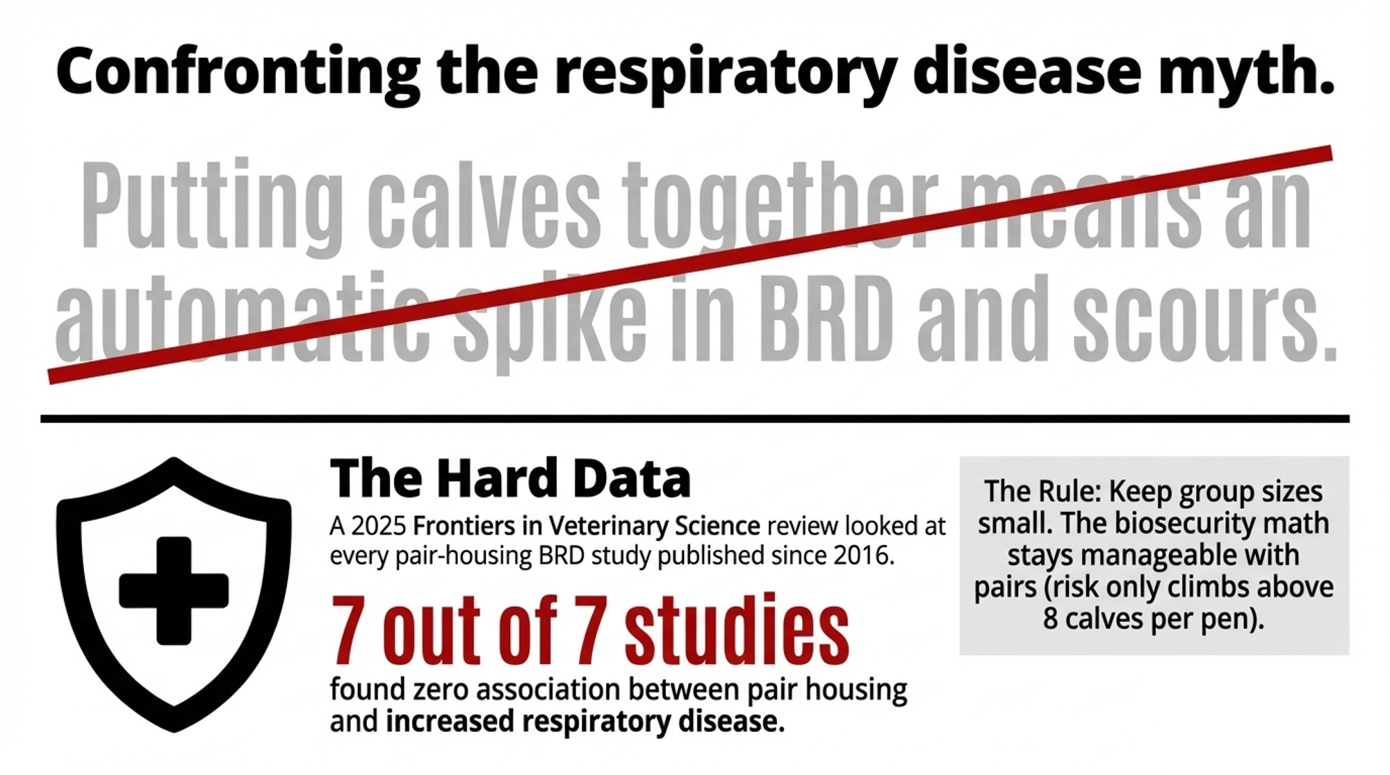 A 2025 scoping review in Frontiers in Veterinary Science, examining pair-housing studies published since 2016, confirmed that pair-housed calves often exhibit better growth performance than individually housed peers. And the health concern that has kept many producers in individual hutches? Seven out of seven BRD studies in that review found no association between pair housing and increased respiratory disease.