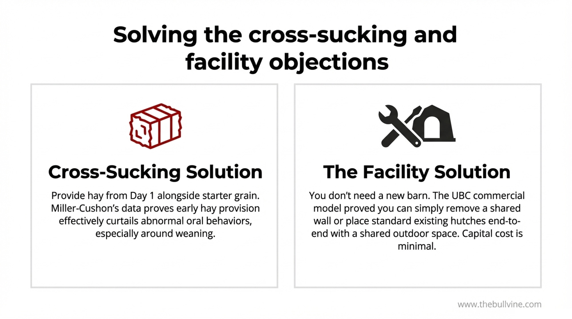 This is the honest friction point. Miller-Cushon’s research is rigorous. The welfare benefits are real. But your calf barn wasn’t built for pairs, and you’ve got real concerns about cross-sucking, disease transmission, and labor.