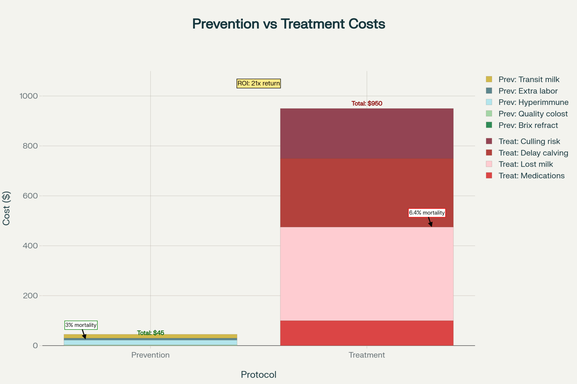 | Colostrum Volume | 2 liters × 2 feedings | 4 liters first feeding | $8/calf | 35× |