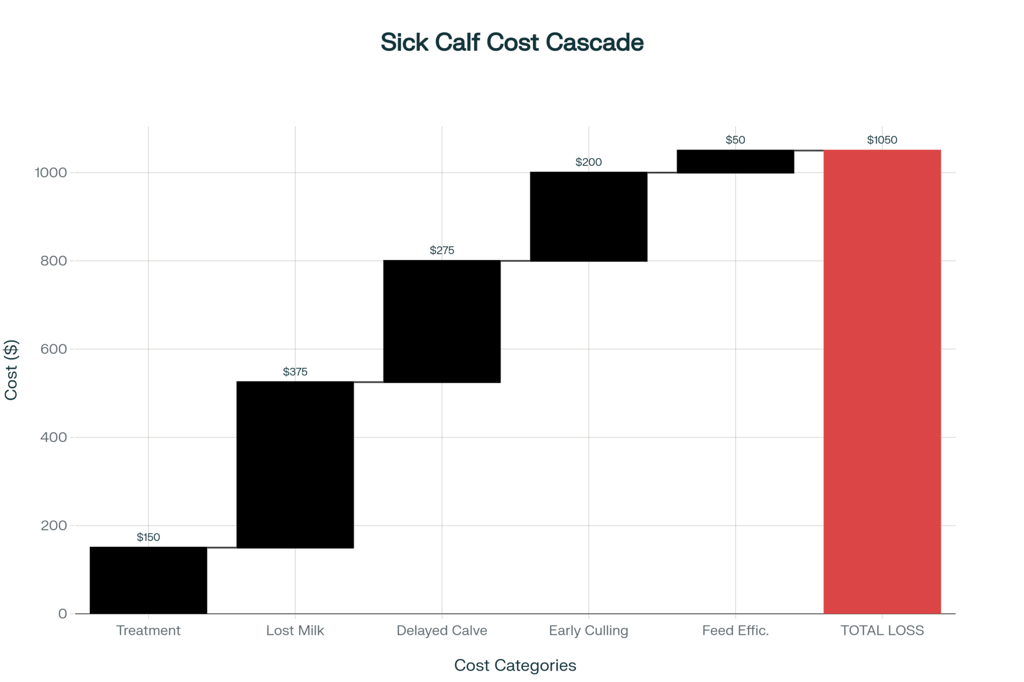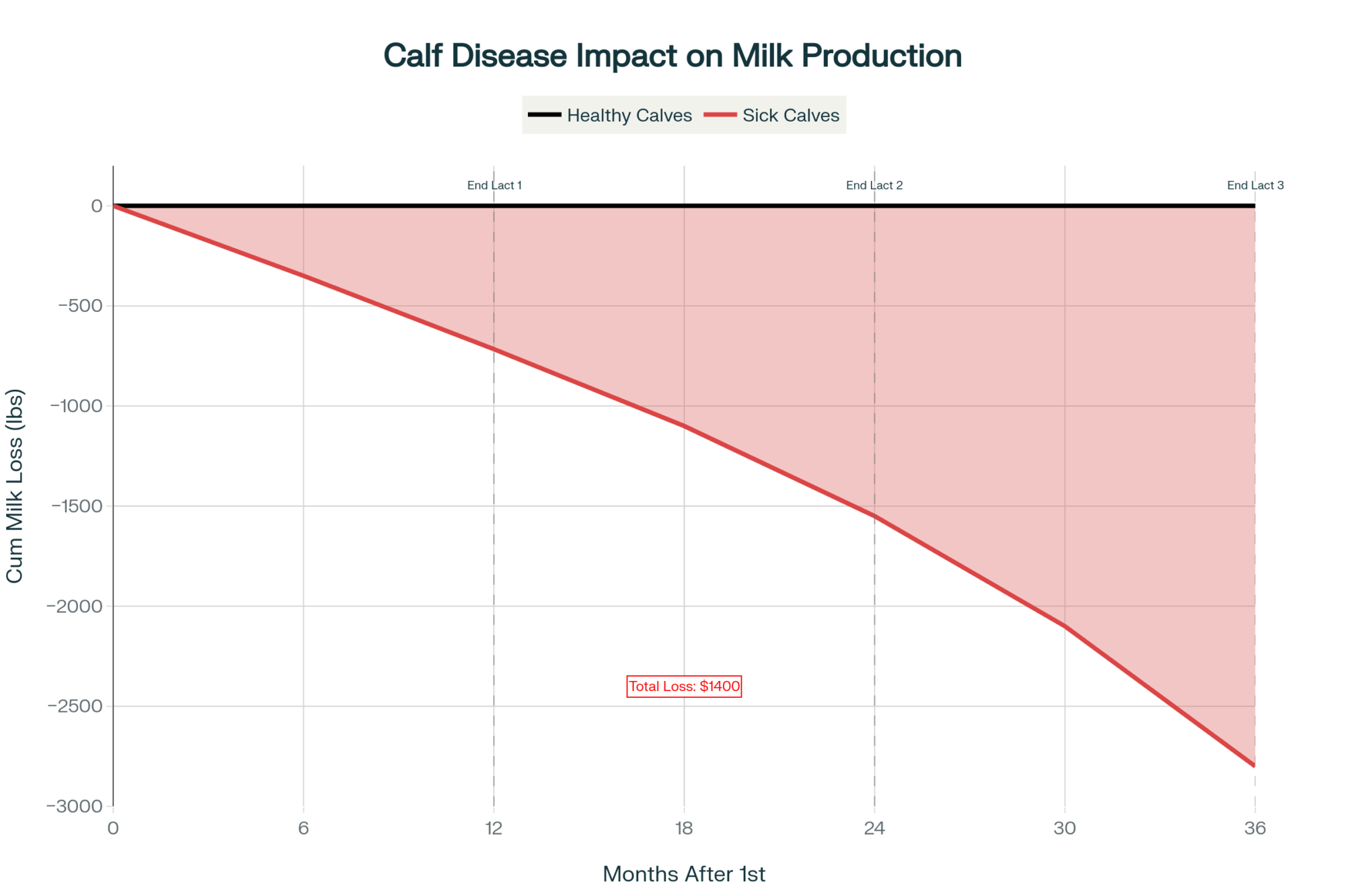 Research from the University of Guelph shows calves that get sick early but recover produce 716.5 pounds less milk in their first lactation. The Journal of Dairy Science has studies pushing that figure up near 1,100 pounds. Penn State Extension documented that these same “recovered” calves are 2.9 times more likely to calve after 30 months, rather than the ideal 22-to 24-month period.