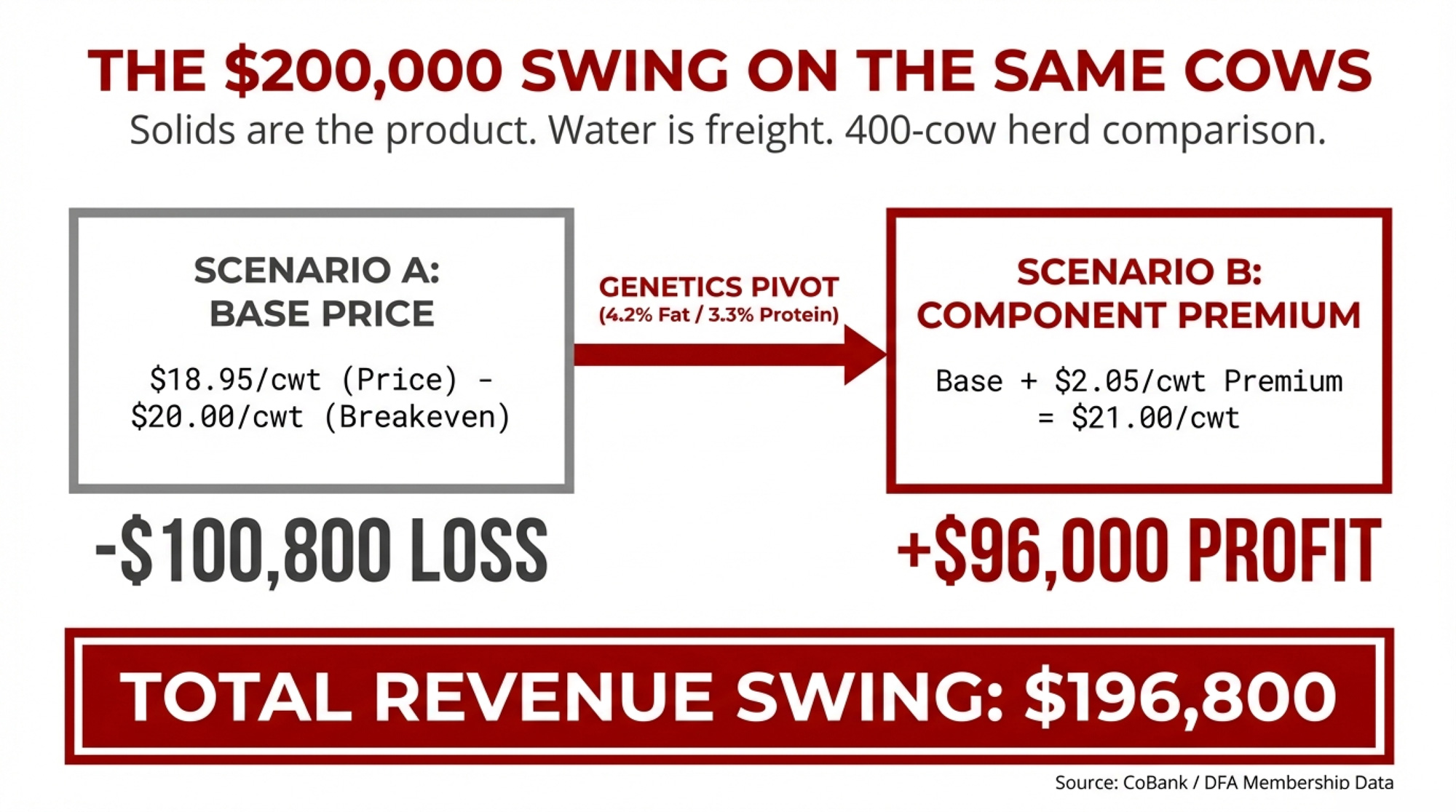 - The $2.05/cwt component swing on a 400-cow, 96,000-cwt herd equals about $196,800/year. If you ship to a cheese plant and aren’t breeding for solids, you’re leaving a six-figure line item on the table.