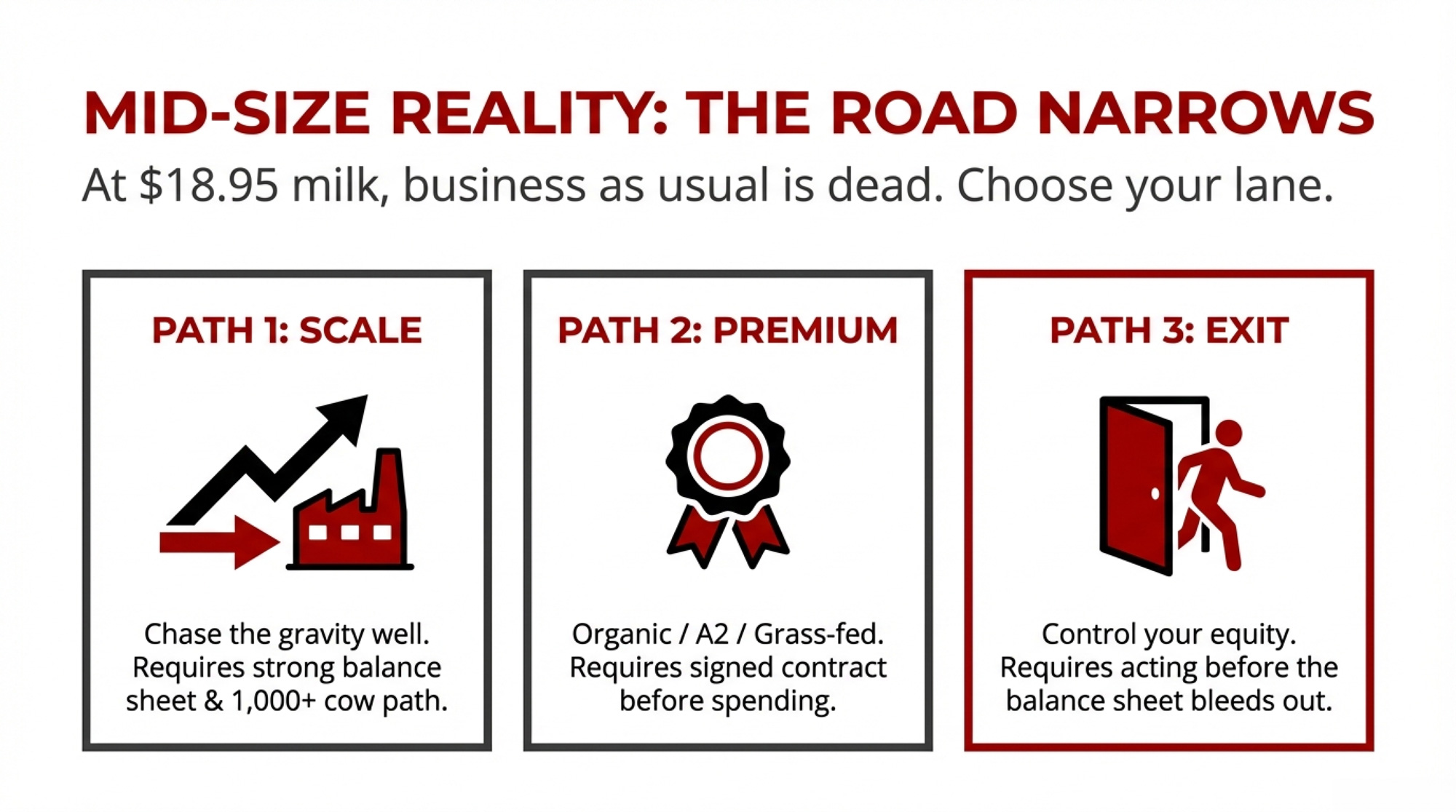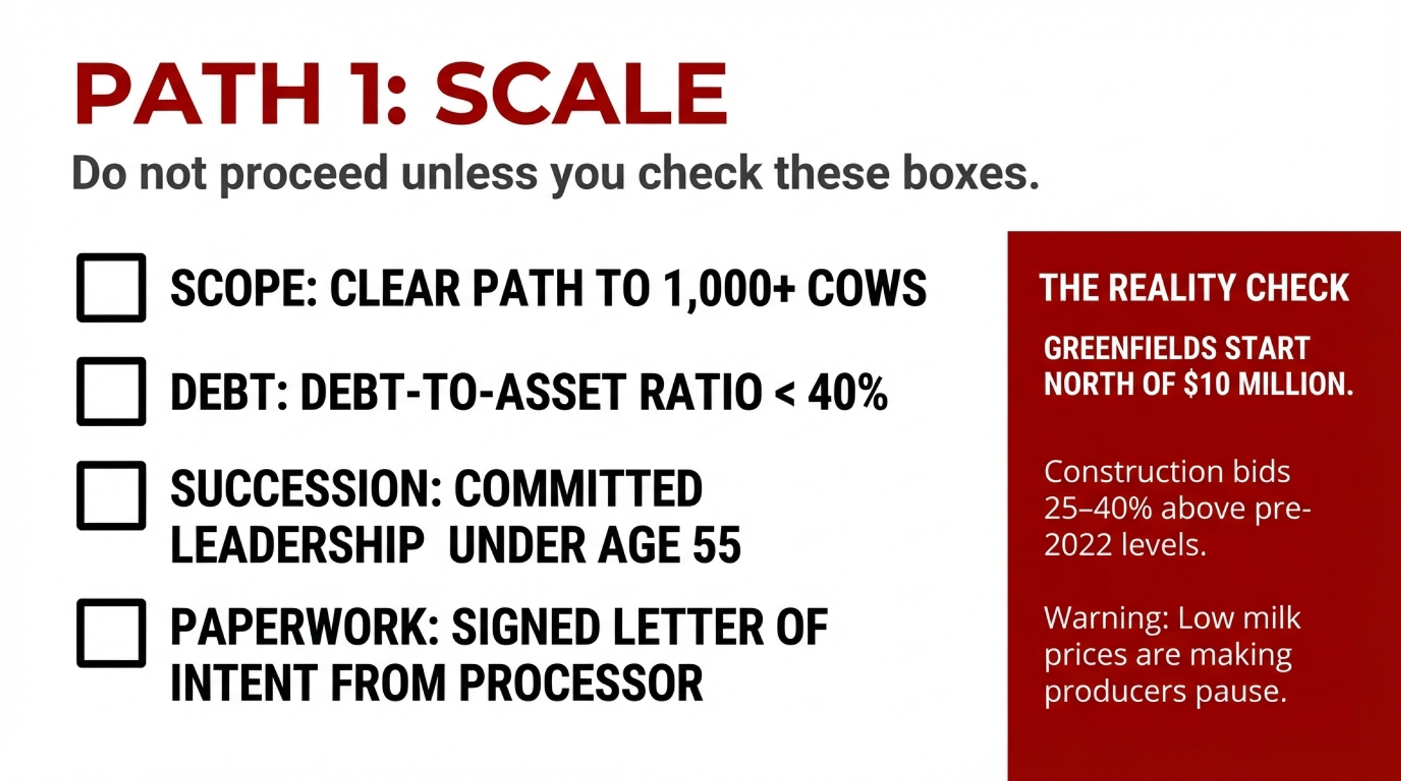| Path 1: Scale Up | 500+ cows, debt-to-asset <40%, under 55, committed successor | Secure letter of intent from target plant (base + component premiums) | Stress-test cash flow at $18/cwt for 12 months | If breakeven >$24/cwt with no improvement, Path 1 isn’t yours |