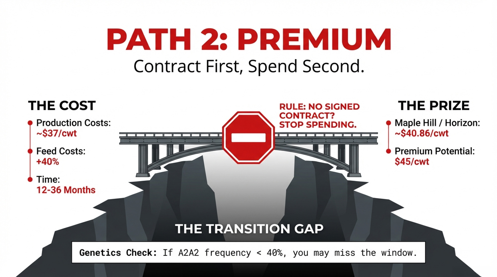 | Path 2: Go Premium | 300 or fewer cows, 2+ acres pasture per cow | Pull genomic/A2 test results. If A2 frequency <40%, stop | Model full transition: 12–36 months, feed costs +40%, lag before premium checks | No signed contract by day 365? Stop spending for that channel |