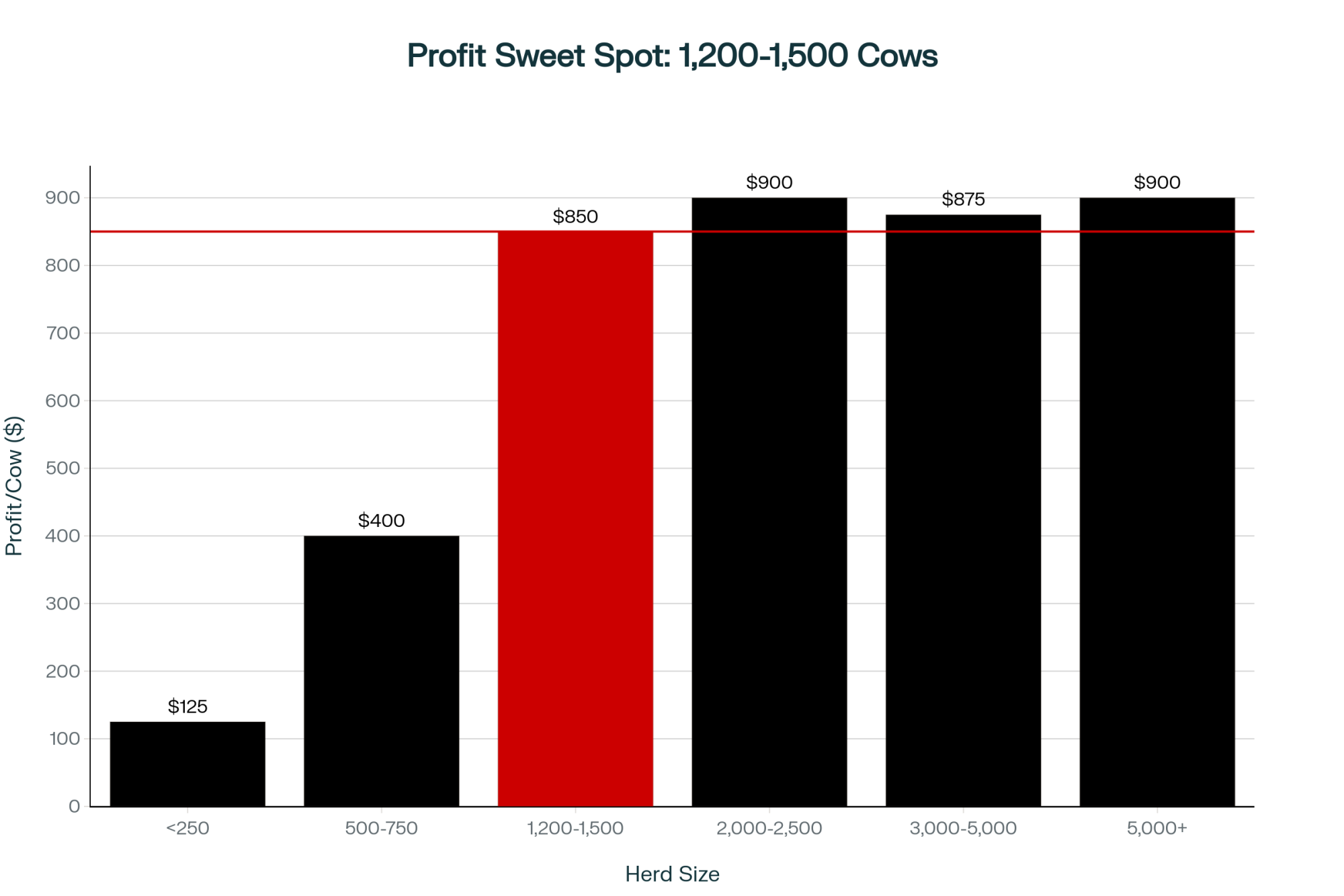 - 1,200-1,500 Cows = Profit Sweet Spot: Beyond 2,500, complexity kills margins. Below 500, scale limits competitiveness. Plan for the middle