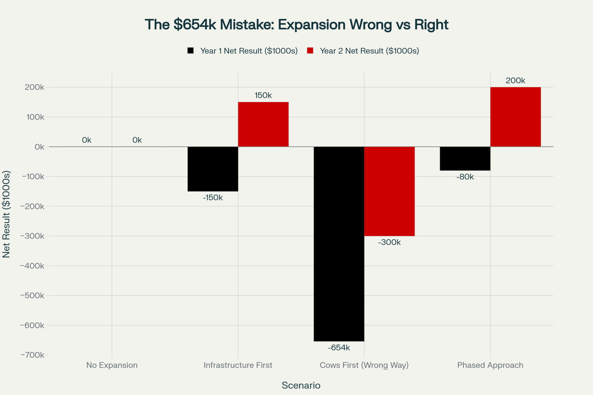 EXECUTIVE SUMMARY: The 3.5-hour rule changes everything: when cows spend more than 3.5 hours away from pens for milking, even ‘successful’ expansions fail. A Wisconsin producer who added 150 cows without upgrading infrastructure now hemorrhages $4,000 daily—a pattern replicated across farms that put cows before concrete. The industry data is unforgiving: proper expansion requires 18-24 months of infrastructure-first planning, $50,000-100,000 in management development, and debt-to-equity ratios under 0.50. Those who expand backwards face average first-year losses of $654,000 and 18-month recovery periods that many don’t survive. With 15,000 dairy farms already gone and processors building for mega-operations, mid-sized farms face a stark choice: master the expansion paradox of building for tomorrow’s herd today, or join the 2,500-3,000 operations projected to close in 2025. The survivors won’t be those who grew fastest, but those who counted minutes, not just cows.