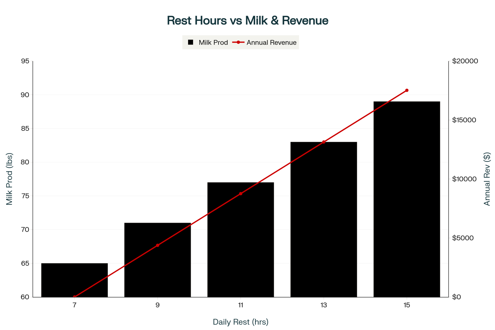 Let’s walk through the math, because this is where it gets real. Say you’ve got 500 cows losing even 90 minutes of rest time. That could mean 750 pounds less milk daily.