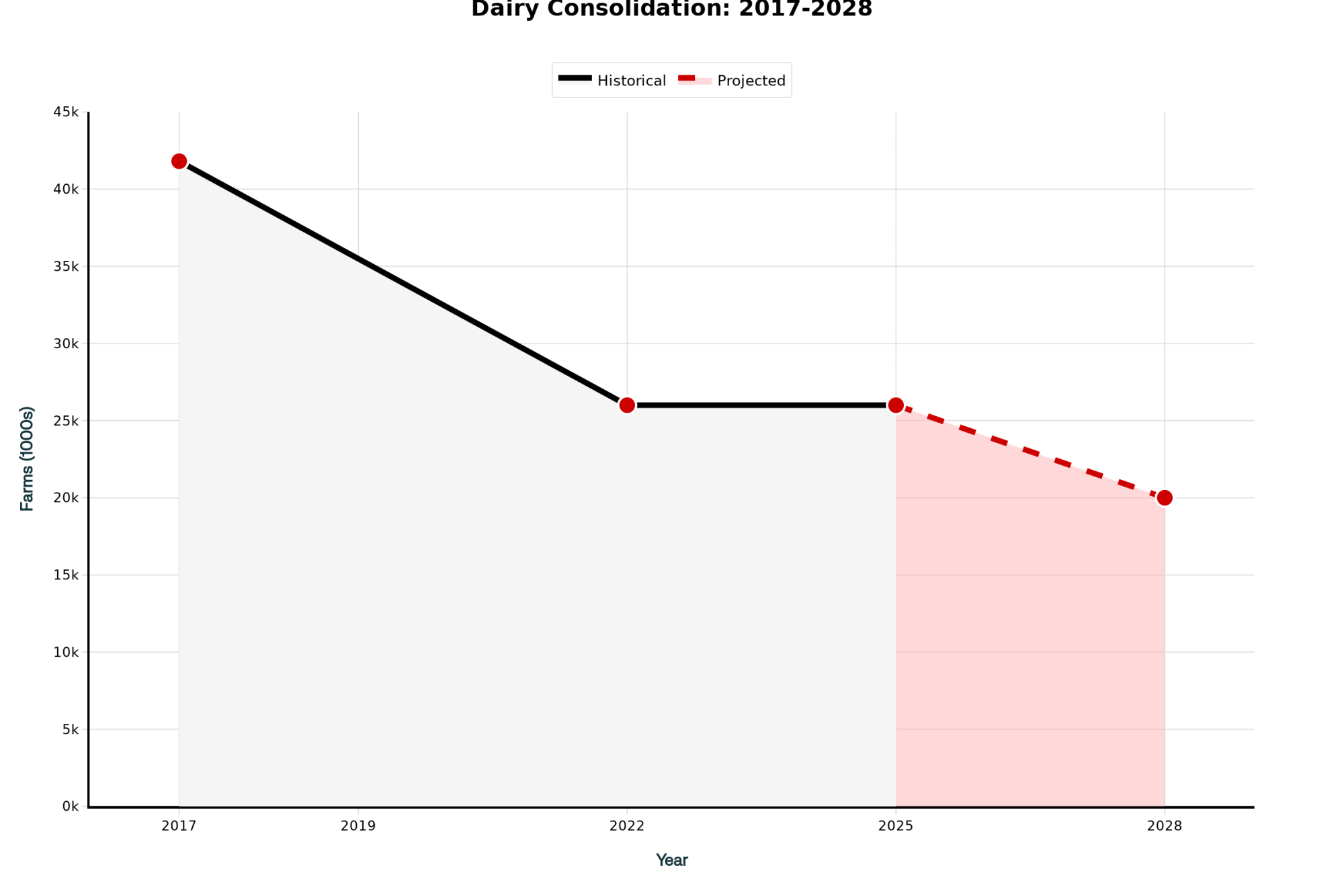 Between 2017 and 2022, USDA census data shows we lost 15,866 dairy farms while milk production increased by 5%. And honestly, that trend seems to be accelerating rather than slowing down.