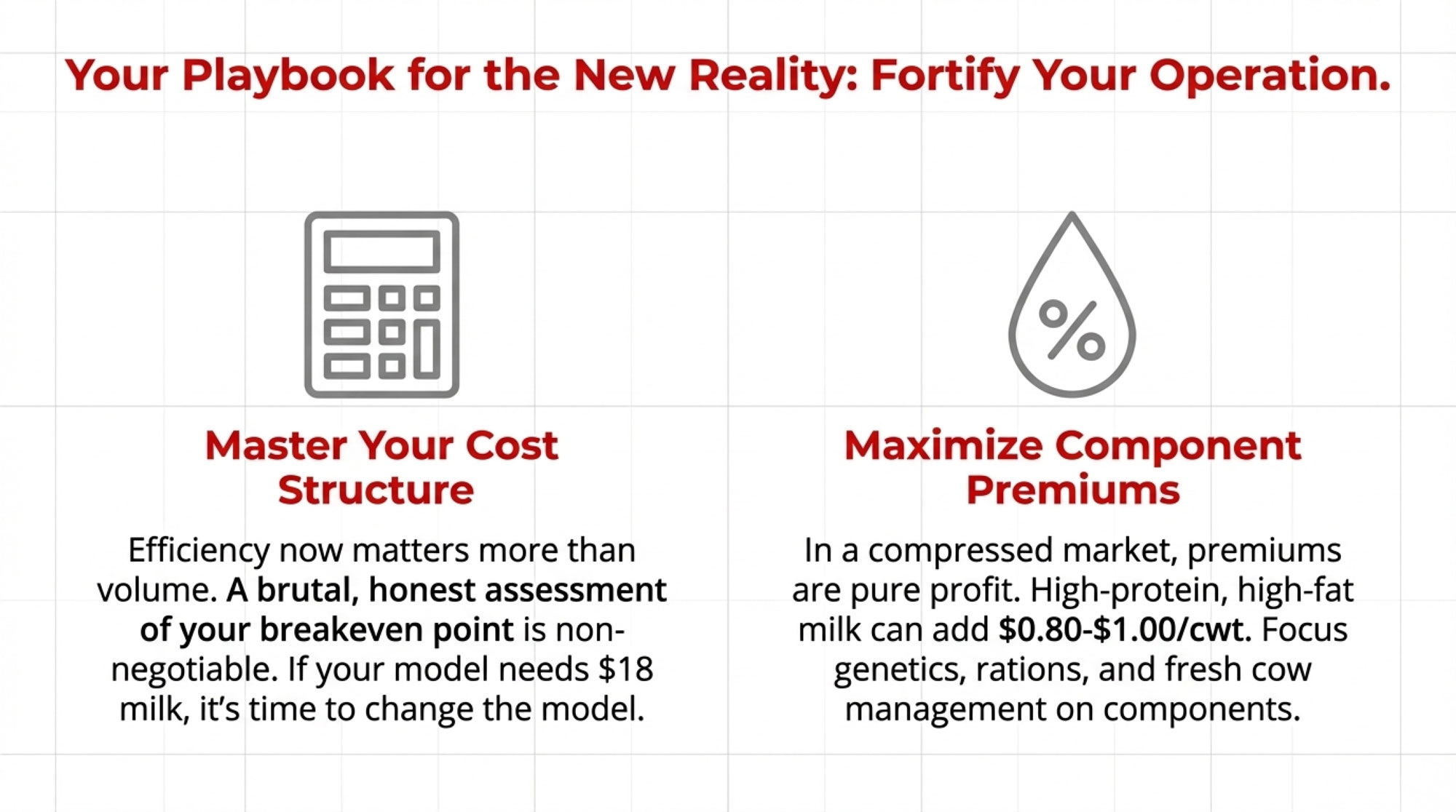 - Immediate Producer Priorities: (1) Cost structure over production volume, (2) Maximize component premiums—they matter most in compressed markets, (3) Strengthen balance sheets before spring, (4) Lock feed costs now via forward contracting.