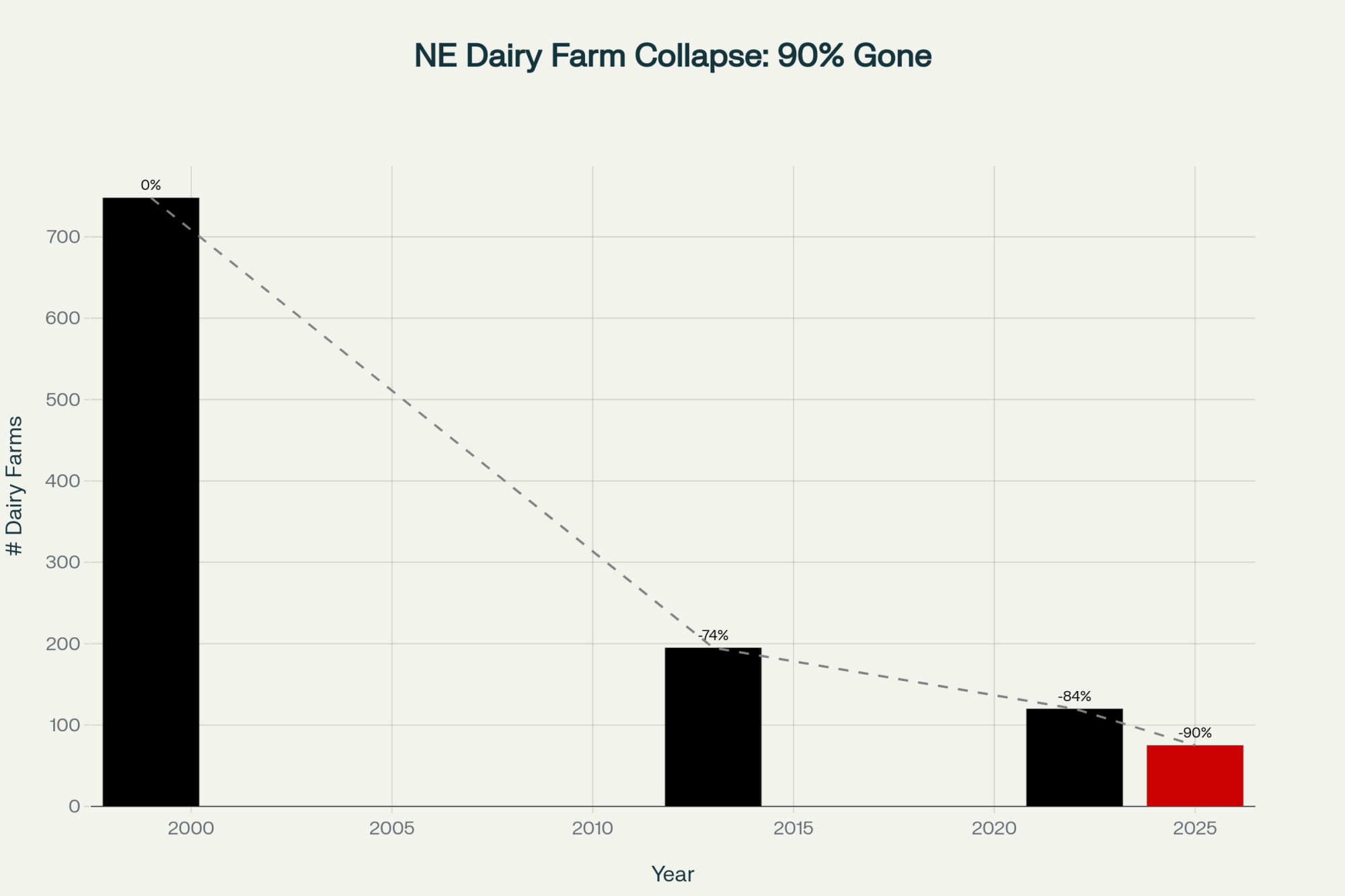 U.S. dairy farming faces an existential consolidation crisis, with farm numbers plummeting from 39,300 operations in 2017 to a projected 10,500 by 2040—a 73% reduction driven by systematic structural advantages favoring mega-operations over traditional family farms, with 1,420 farms disappearing annually as of 2024.