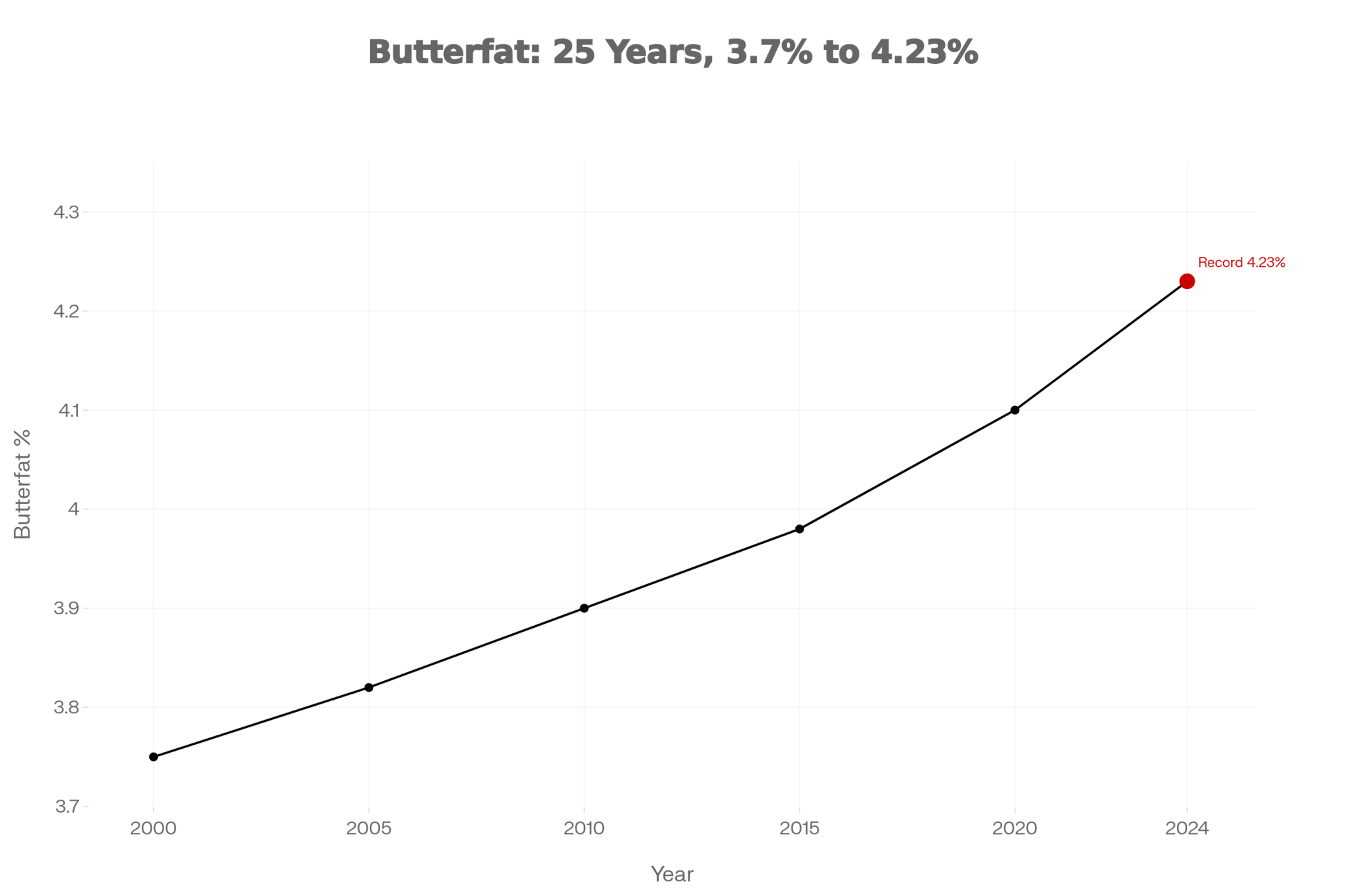 [Image: Line graph showing U.S. average butterfat percentage climbing from 3.7% in 2000 to 4.23% in 2024]