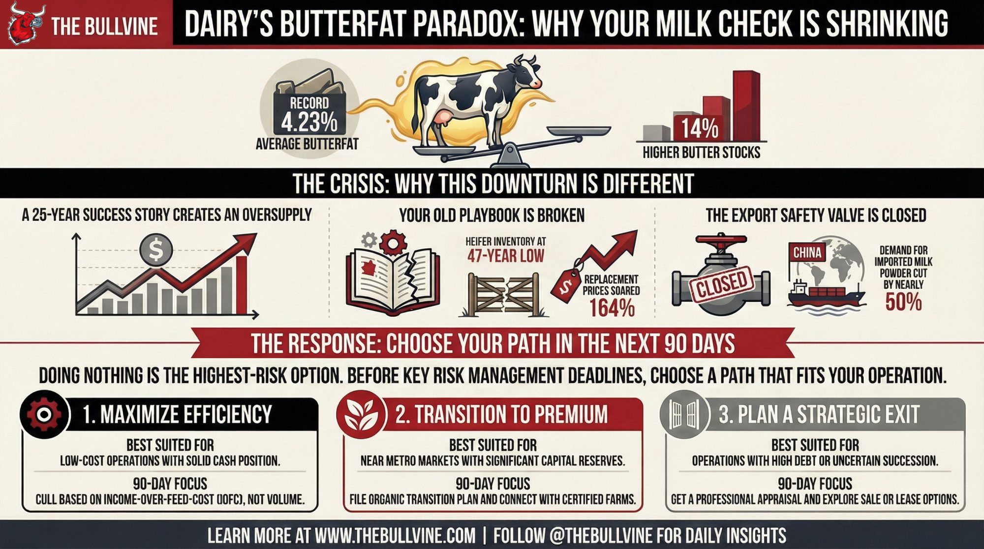 Executive Summary: Here’s the paradox: U.S. dairy herds are testing 4.23% butterfat—an all-time record—yet milk checks are running $3-5/cwt below last year. The genetic industry’s 25-year push for components worked perfectly, and now everyone’s drowning in the success. Butter stocks are up 14%, Class IV prices hit $13.89/cwt in November (lowest since 2020), and the traditional cull-and-restock response is off the table with springers at $3,000+ and heifer inventory at a 47-year low. For operations in the 500-1,500 cow range carrying moderate debt, the next 90 days are decisive—DMC enrollment closes in February, DRP in March, and the choices made before spring will separate farms that reposition from those that get squeezed. Three viable paths exist: optimize for efficiency, transition to premium markets, or exit strategically while equity remains. Standing still isn’t on the list.
