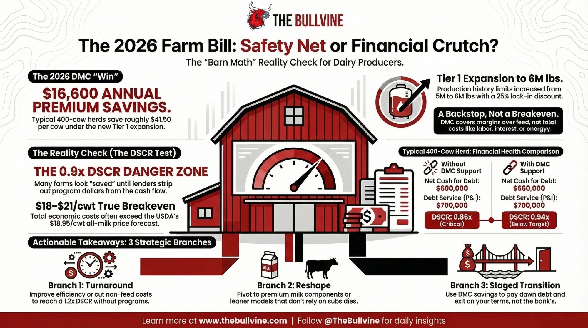 - If your DSCR sits below 1.0x without DMC, you’re past a rough‑year problem. You’re looking at a business‑model question the 2026 farm bill can’t fix on its own.