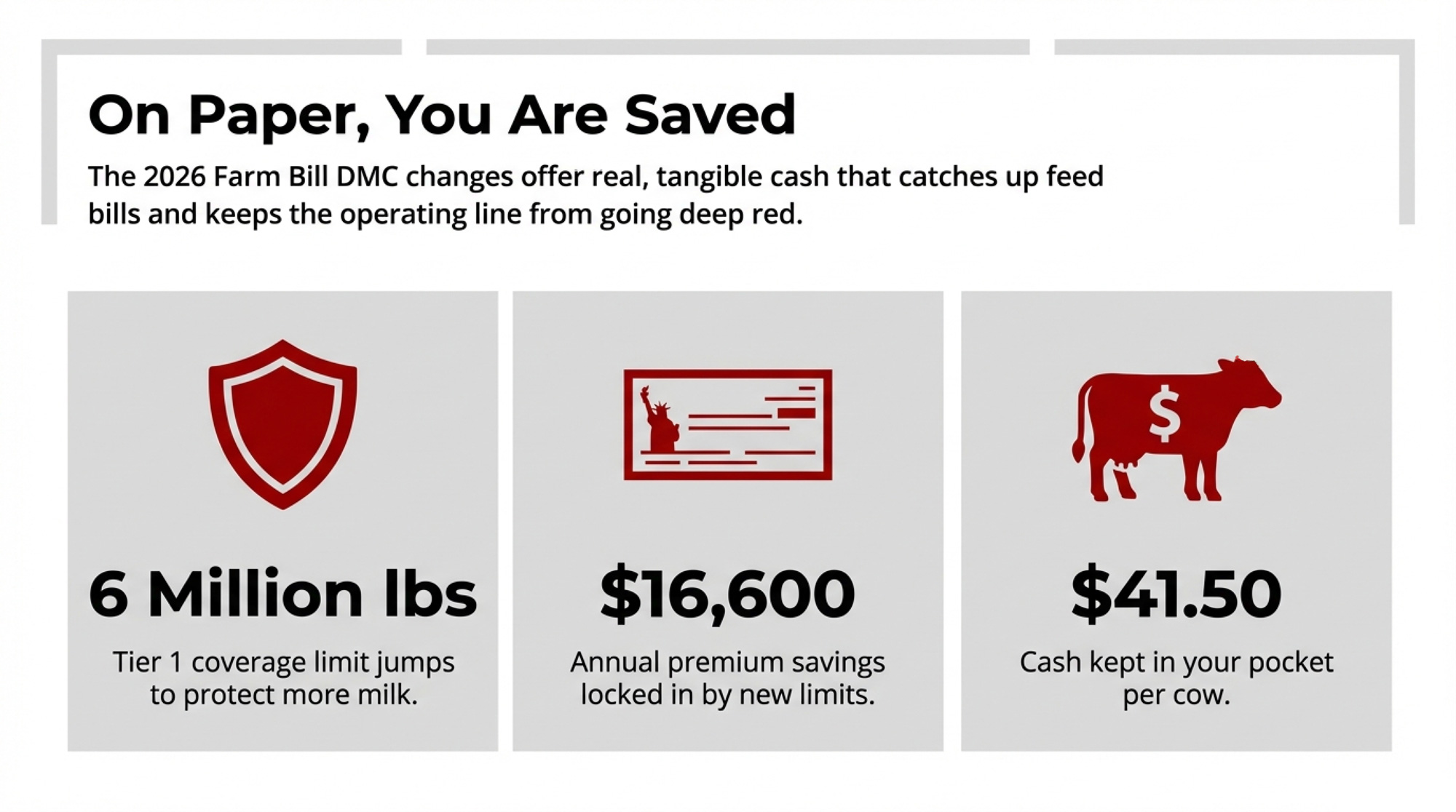 | DMC Tier 1 expansion | $41.50/cow/year premium savings | ✅ Max out immediately. Lock in 6-year discount. |