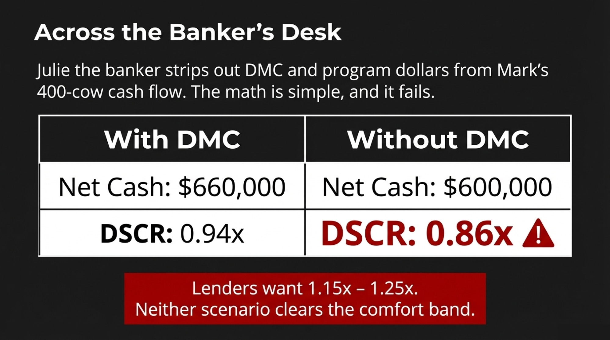 Across the lender’s desk, once his banker, Julie, pulls DMC and other program dollars out of the cash flow, the number is simple: around 0.9x DSCR. Without government support, the cash flow doesn’t fully cover annual debt service.