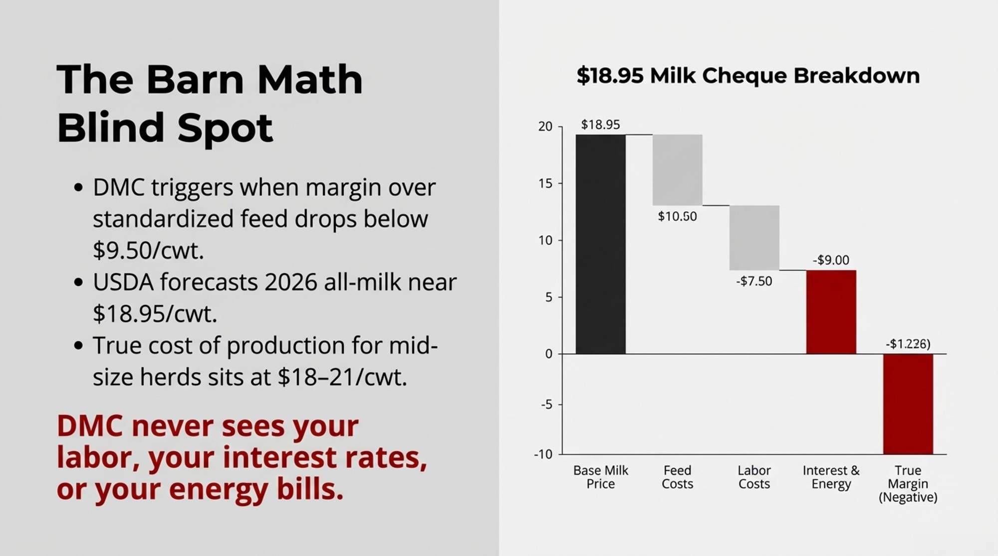 - A DMC margin trigger that calls the farm “covered” as long as income over standardized national feed costsstays above $9.50/cwt — with no view of labour, interest, energy, or family draw.