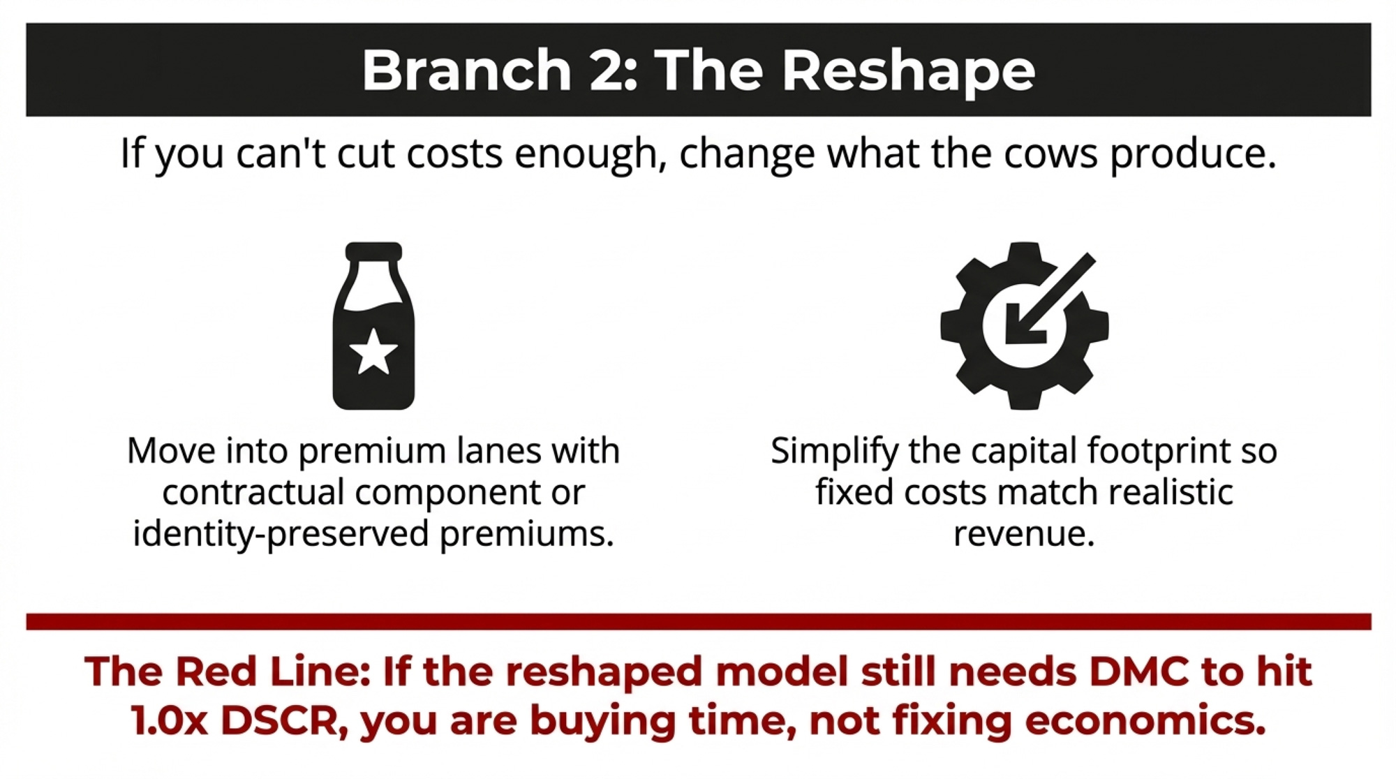Mark’s in this lane if “no‑program” DSCR can realistically climb to ≥1.2x within 12–24 months through specific moves: a disciplined cull plan that raises milk per stall; a concrete labour change that lowers non‑feed cost/cwt; selling non‑core assets to knock down debt per cow. In that world, DMC works as designed — a floor under feed‑margin risk, not a permanent revenue line.
