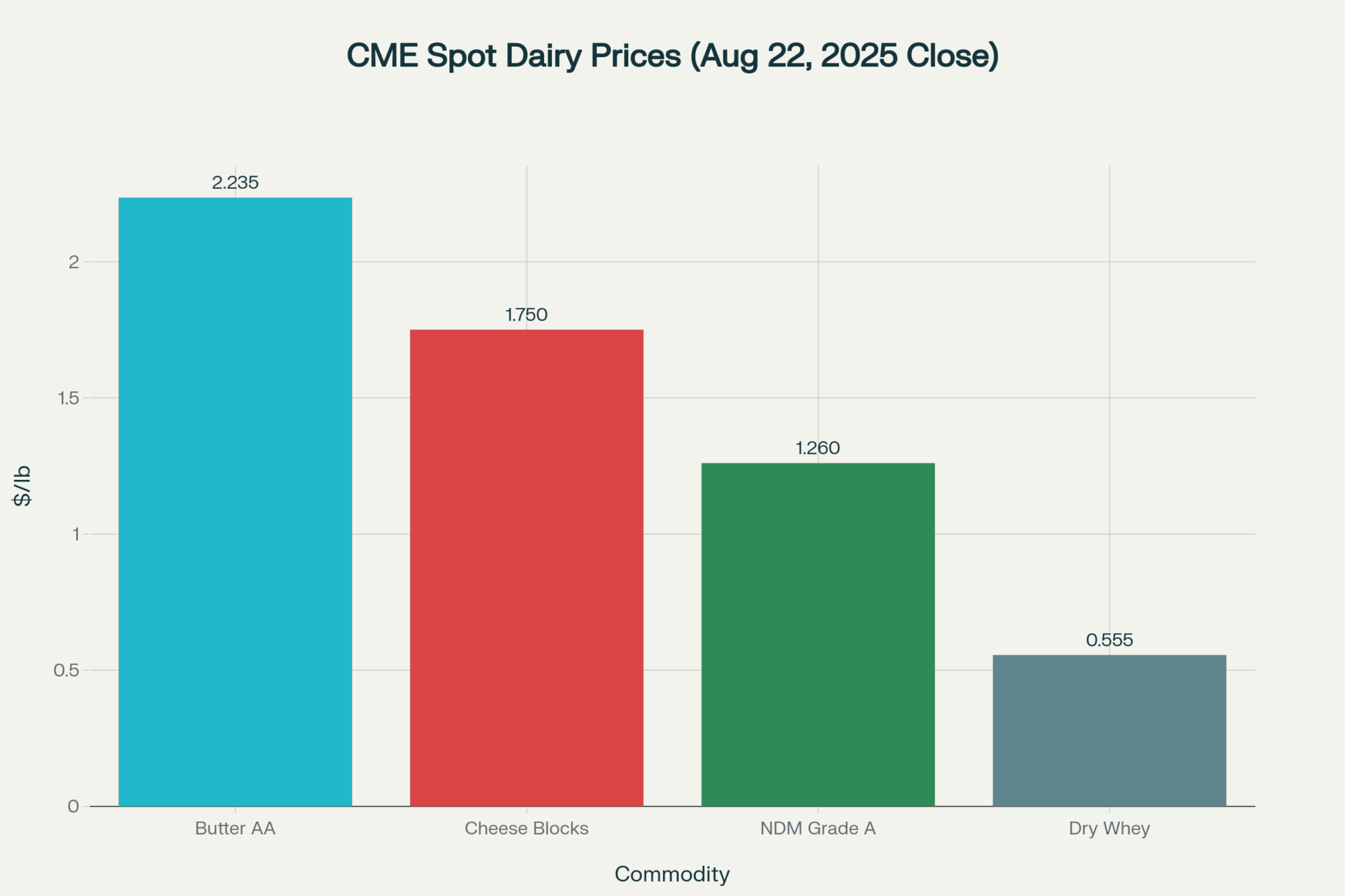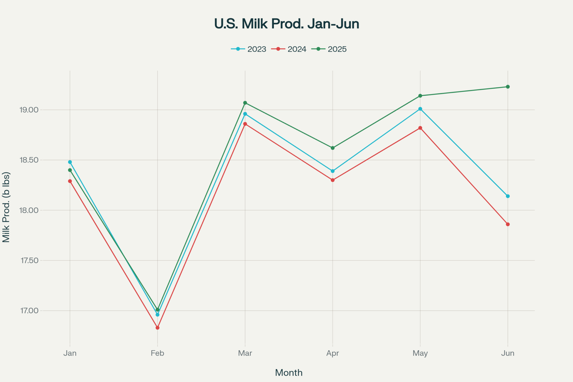 This time? New Zealand just reported milk collection in August 2025 at 1.68 billion liters, up 14.6% from last year, according to the Dairy Companies Association. U.S. production is up 1.6% despite everything, per the USDA’s latest report. And the weather’s been perfect for grass growth pretty much everywhere. No natural brakes this time around.