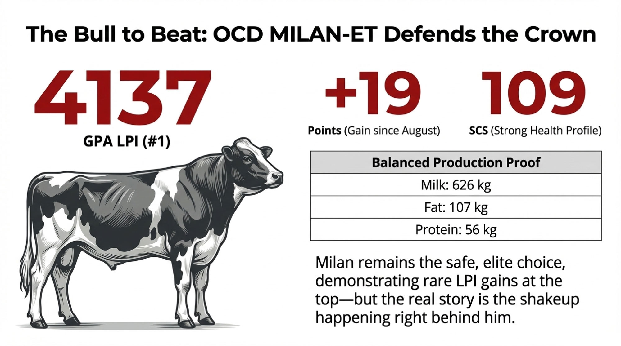 OCD MILAN-ET remains the bull to beat, actually increasing his GPA LPI from 4118 in August to 4137 in December—a 19-point gain that’s rare at this elite level. His production profile shows 626 kg of Milk, 107 kg of Fat, and 56 kg of Protein.