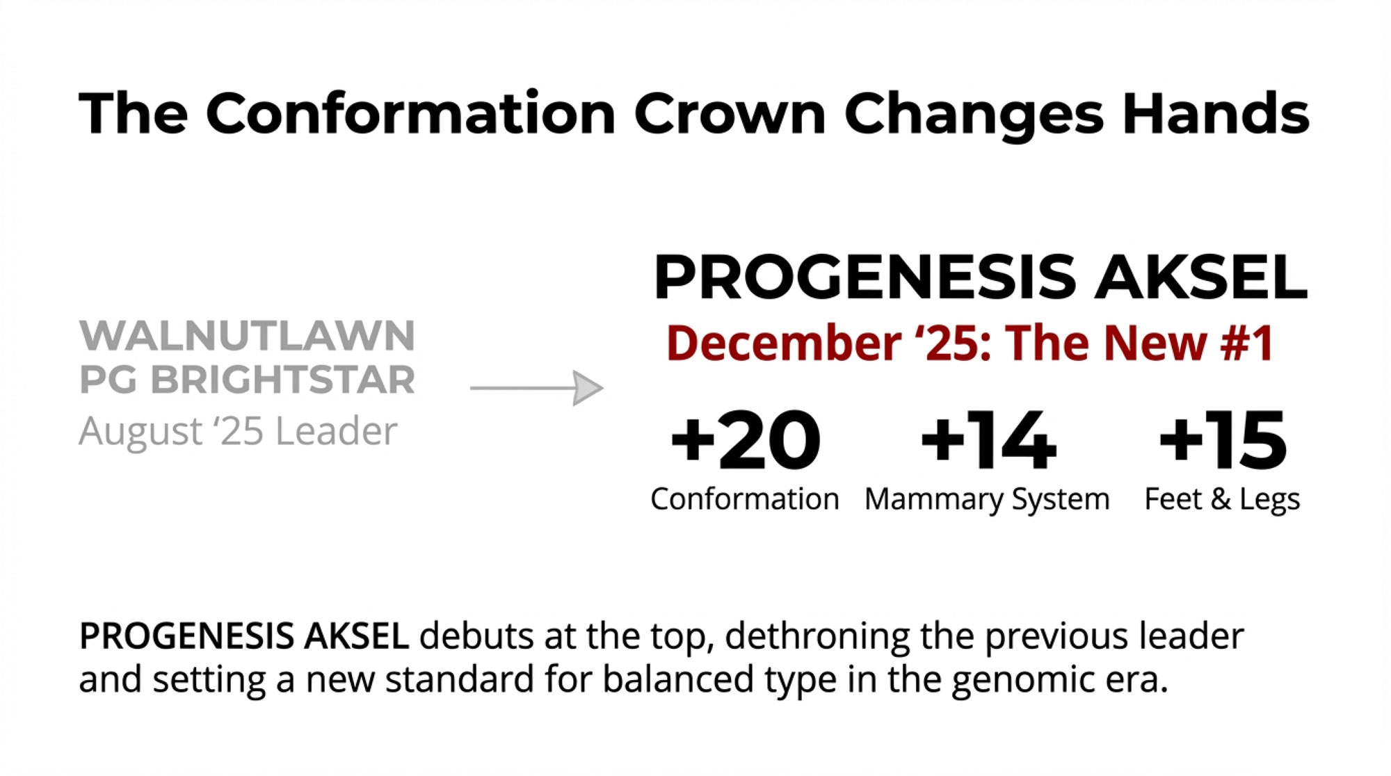 BEYOND HI-LEVEL just hit 165 kg fat and jumped 11 spots. PROGENESIS AKSEL took the type crown. Your December matings need revision—now.