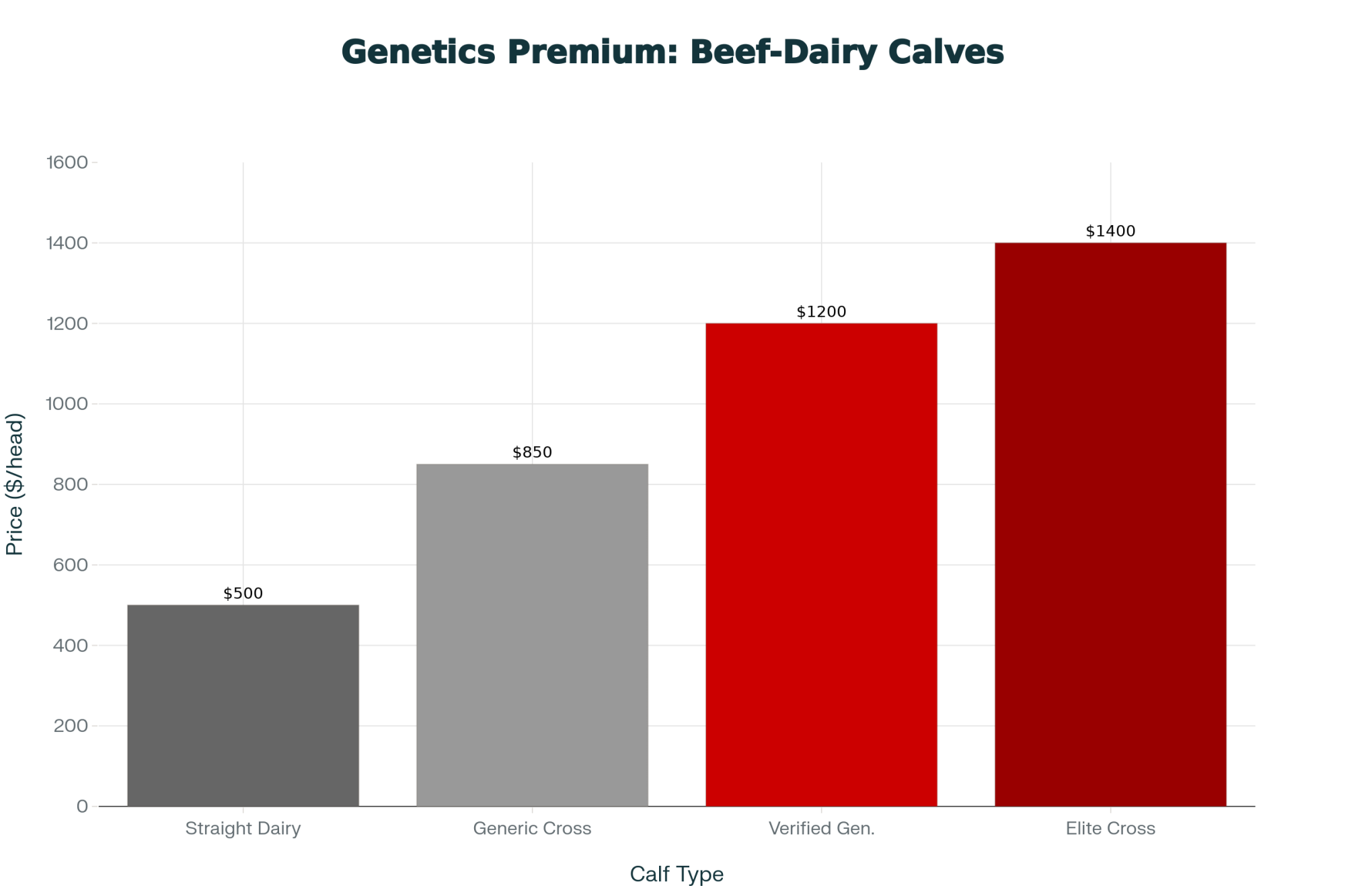 - Beef-on-dairy with verified genetics: $1,000-$1,400/calf. Straight dairy: $400-$600. The genetics gap is worth hundreds per head.
