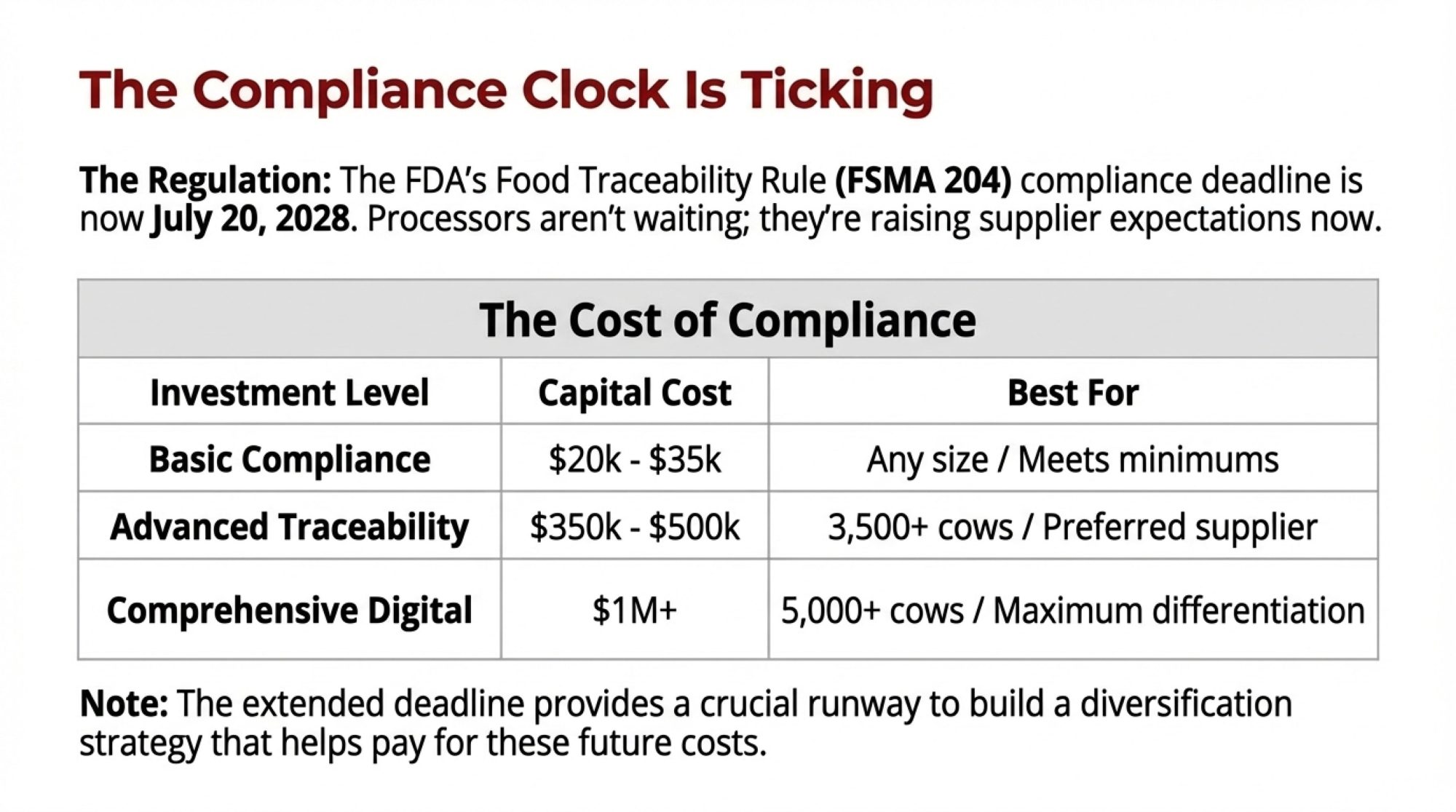 Mid-size operations (500-2,000 cows): This is arguably the most challenging position currently. Large enough that specialty market pivots are difficult, but lacking scale for major technology investments to generate positive returns individually. Cooperative approaches to shared infrastructure, combined with beef-on-dairy diversification using verified genetics, represent viable near-term strategies. The extended FSMA timeline—mid-2028—provides runway to explore options.