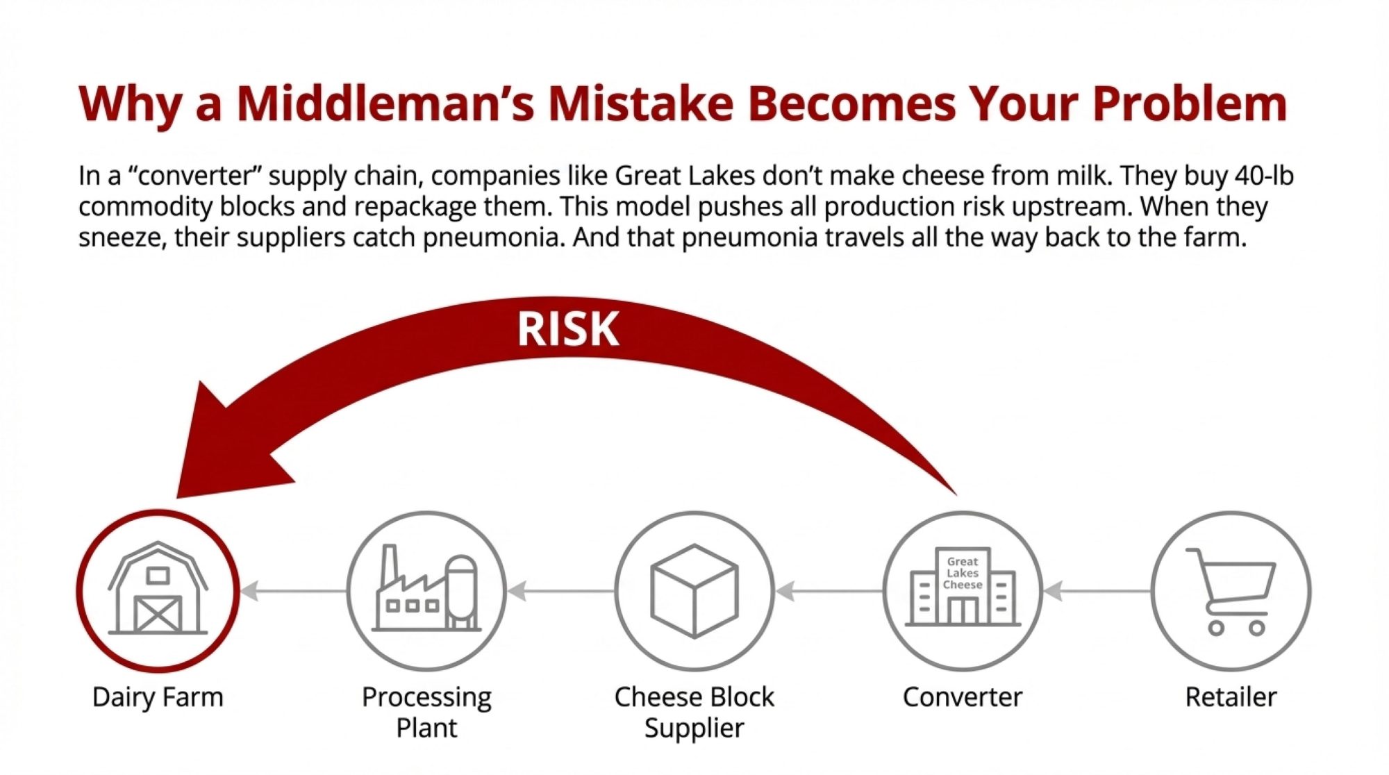 The Great Lakes Cheese recall didn’t create these dynamics. But it made them visible in ways worth understanding. When a quality control issue at a supplier you’ve never heard of can affect your milk revenue, it reveals something meaningful about the supply chain’s structure and risk distribution.