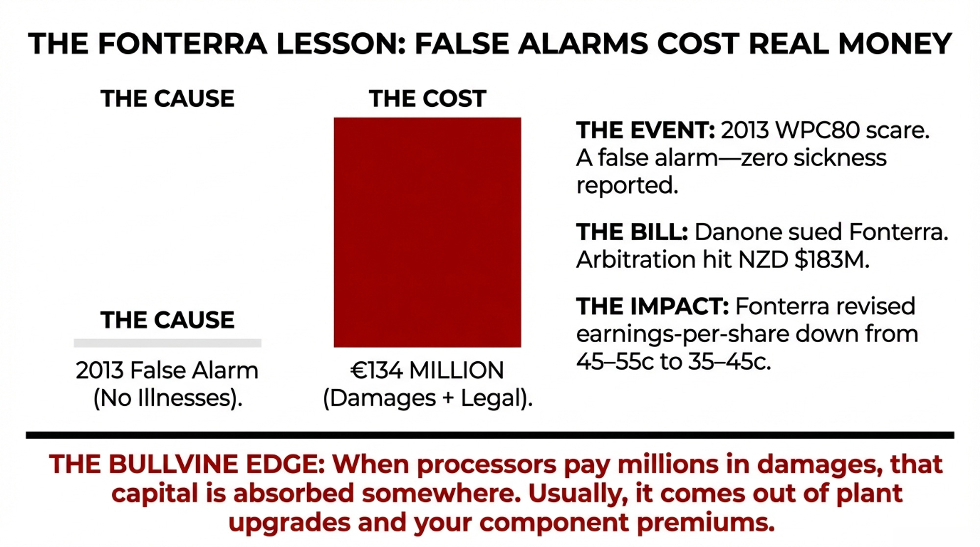 And here’s the other number worth sitting with: that $34.4 million price-fixing settlement — in which, again, neither cooperative admitted liability — covers roughly 8,000 producers who marketed milk during the affected timeframe (per the settlement class definition). That works out to approximately $4,300 per farm before legal fees. The potential brand-premium loss from a welfare scandal dwarfs that. Unlike a one-time settlement, premium erosion compounds every month the brand stays damaged.