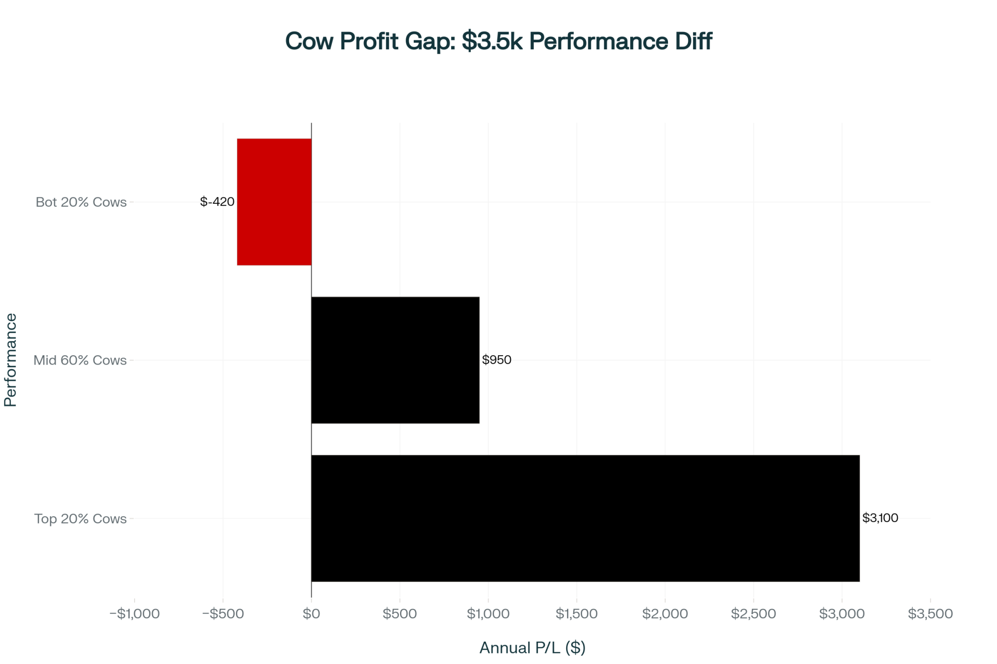 You’ve got 500 cows producing 25,000 pounds annually? That efficiency gap is worth about $79,000. Not from buying new equipment—just from doing what you’re already doing better.