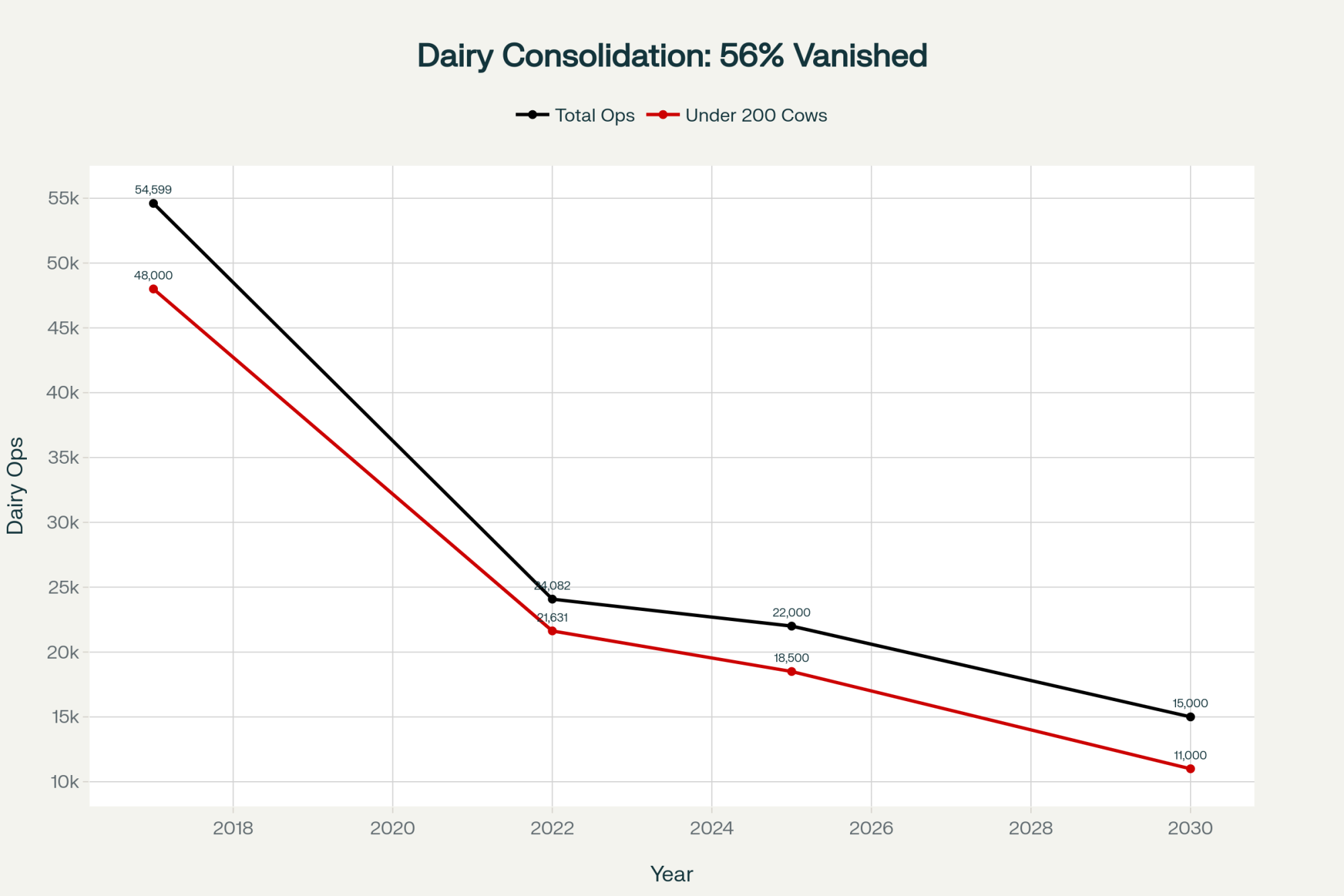 USDA tells us we lost 15,221 dairy farms between 2017 and 2022—that’s 39% gone. And when you see big farms running at $17/cwt while small farms face $33/cwt according to the USDA’s Economic Research Service, it looks pretty hopeless for the little guys.