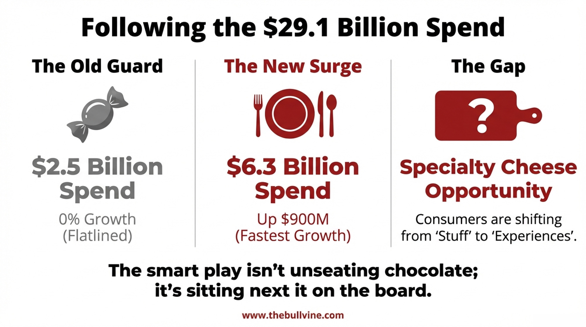 The story is clear. Candy flat-lined. Experience spending surged. That $900 million jump in “evening out” tells you consumers are spending more on shared experiences — and cheese boards positioned as a date-night-at-home experience tap directly into that shift.