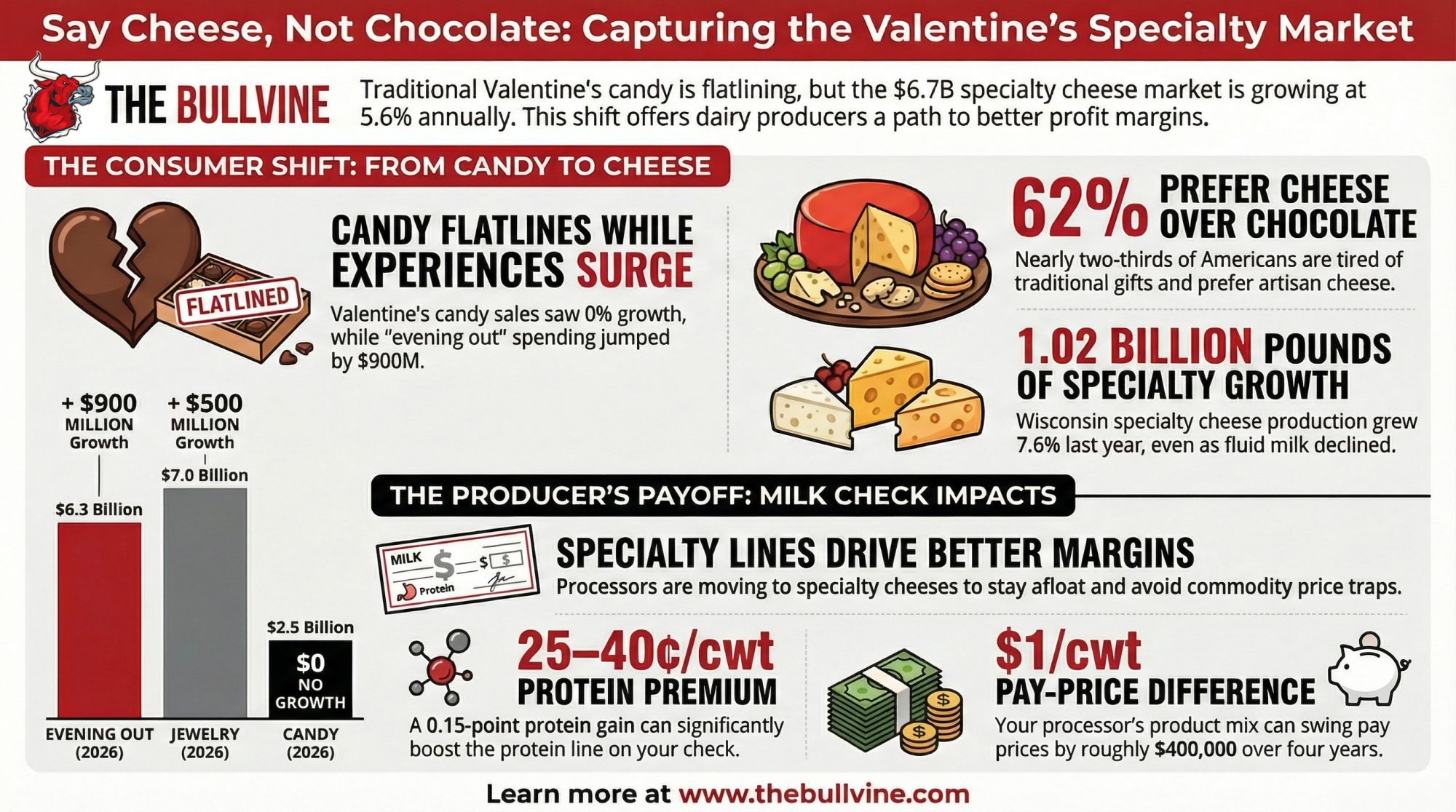 Executive Summary: Americans are on track to spend a record $29.1 billion on Valentine’s Day in 2026, but candy — at $2.5 billion — is the only major category that hasn’t grown at all. A Wakefield Research survey for Wisconsin Cheese shows 62% of Americans are tired of traditional gifts and 64% would trade roses for wedges of artisan cheese, while the US specialty cheese market has climbed to $6.67 billion and is growing 5.6% a year. Wisconsin now produces 1.02 billion pounds of specialty cheese — 53% of the US total — and is testing the Valentine’s opportunity with farmstead boards from Crave Brothers and a $100 Wedges of Love bouquet from Wisconsin Cheese. The catch is that processors like Klondike openly admit that specialty cheese keeps their business afloat, yet there’s no clean public data showing how much of that premium flows back as component bonuses on your milk check. Bullvine’s own component grid math shows a 0.15-point protein gain can add 25–40¢/cwt, and processor product mix can swing pay price by about $1/cwt over time. This feature walks through the numbers, the farmstead vs. coalition paths, and the seasonal risk so you can decide if and where Valentine’s specialty cheese fits in your own herd strategy.