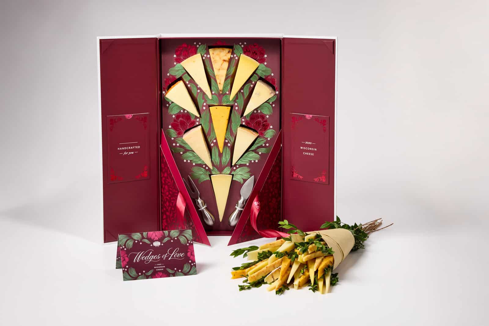 Dairy Farmers of Wisconsin went bigger. On National Cheese Lovers Day (January 20), Wisconsin Cheese launched Wedges of Love — a bouquet-style gift box featuring nine award-winning artisan cheeses arranged like a floral bouquet. Retail price: $100 with free overnight shipping. It includes four stainless steel knives, a personalized poem, and pairing guides.