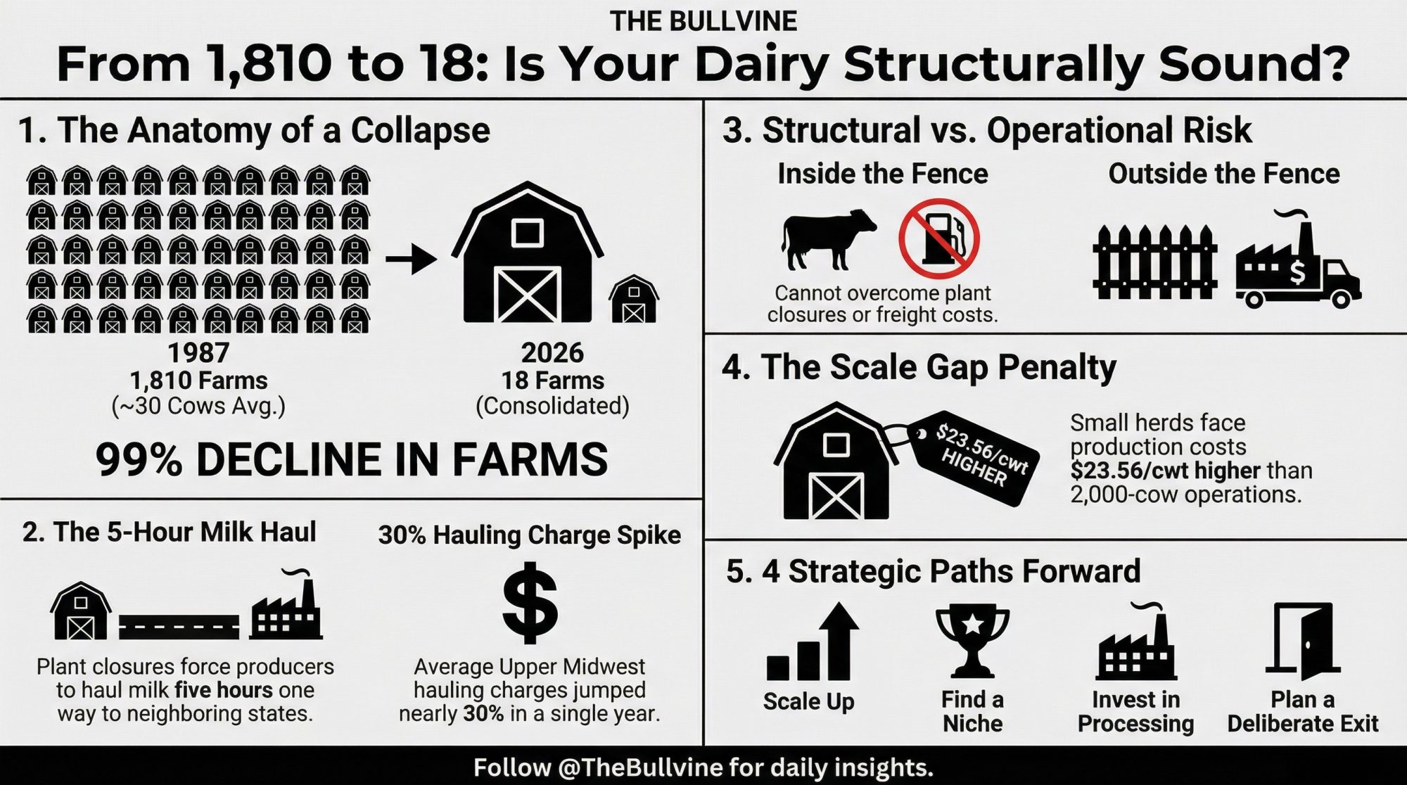 - North Dakota’s crash from 1,810 dairies to 18 is your warning label for what happens when processing deserts, long hauls, and weak basis stack up.