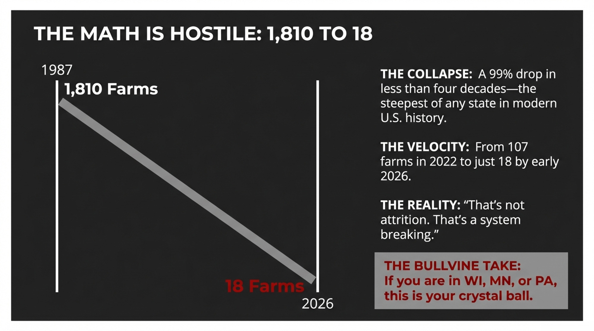 From 107 farms in 2022 to 18 by early 2026. That’s not attrition. That’s a system breaking.