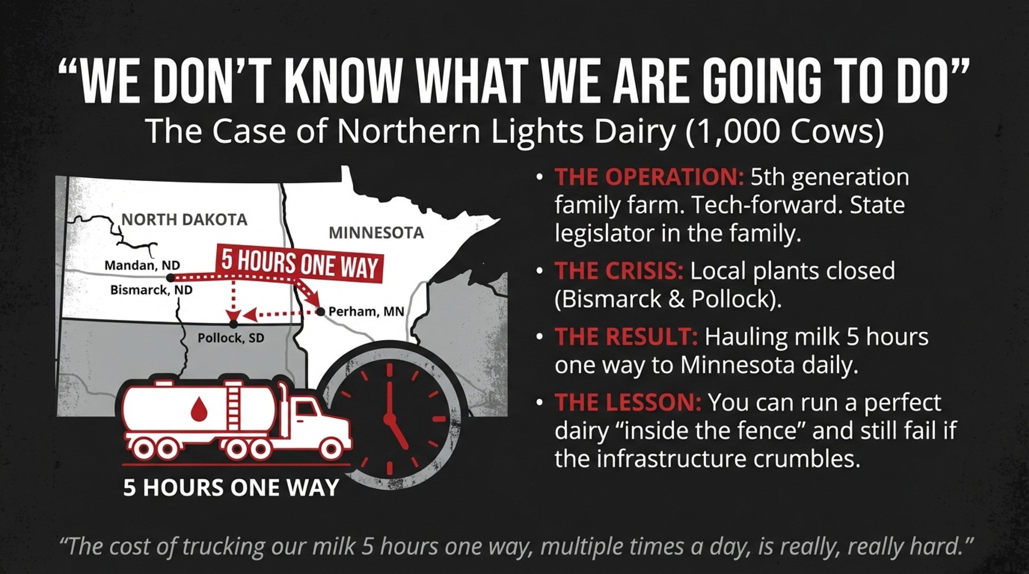 Northern Lights Dairy sits about 12 miles south of Mandan, North Dakota — a 1,000‑cow Holstein operation run by the Holle family. Over the past 30 months, the Holles have been forced to find a new market for their milk twice. Not because of anything they did wrong, but because every processing facility in their state either closed or stopped taking raw milk. They now ship to a Bongards plant in Perham, Minnesota—a haul that runs about 5 hours one way, several times a day.