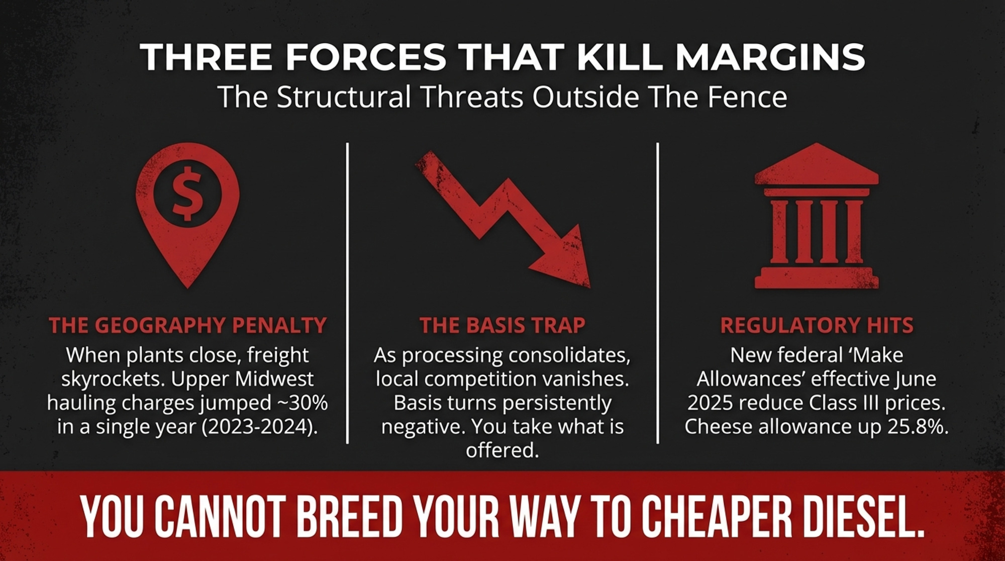 Your dairy is only as viable as your ability to get raw milk onto a truck and into a plant at a cost that leaves a margin. When that chain breaks, everything you do inside the fence — genetics, feed efficiency, cow comfort — stops mattering.