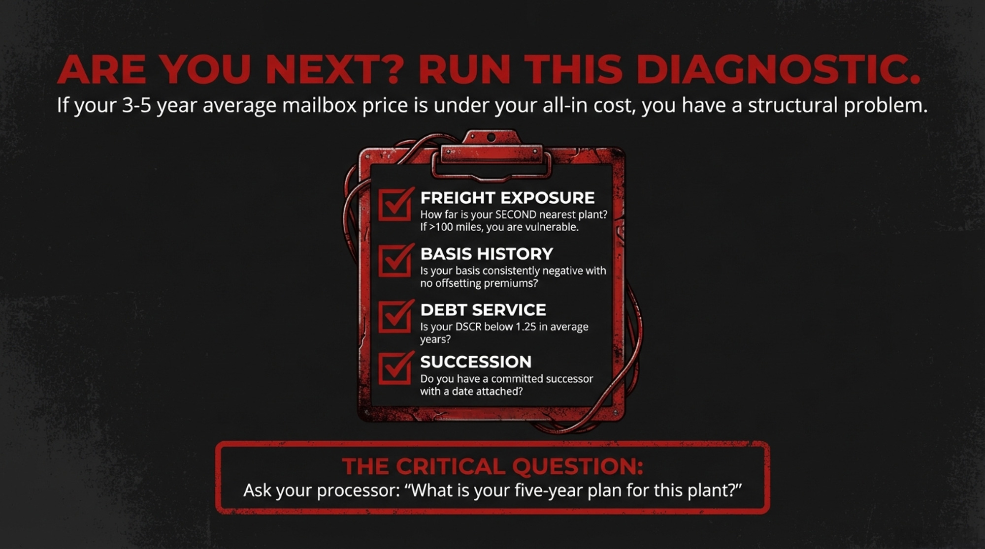 The core diagnostic is one number: your true all‑in cost of production per hundredweight — including family labor at a realistic market wage, full debt service, and capital replacement — minus your three‑to‑five‑year average mailbox price after hauling, co‑op fees, and deductions. If that gap is consistently negative, you’re not in a bad year. You’re in the same structural position that killed 1,792 North Dakota dairies.