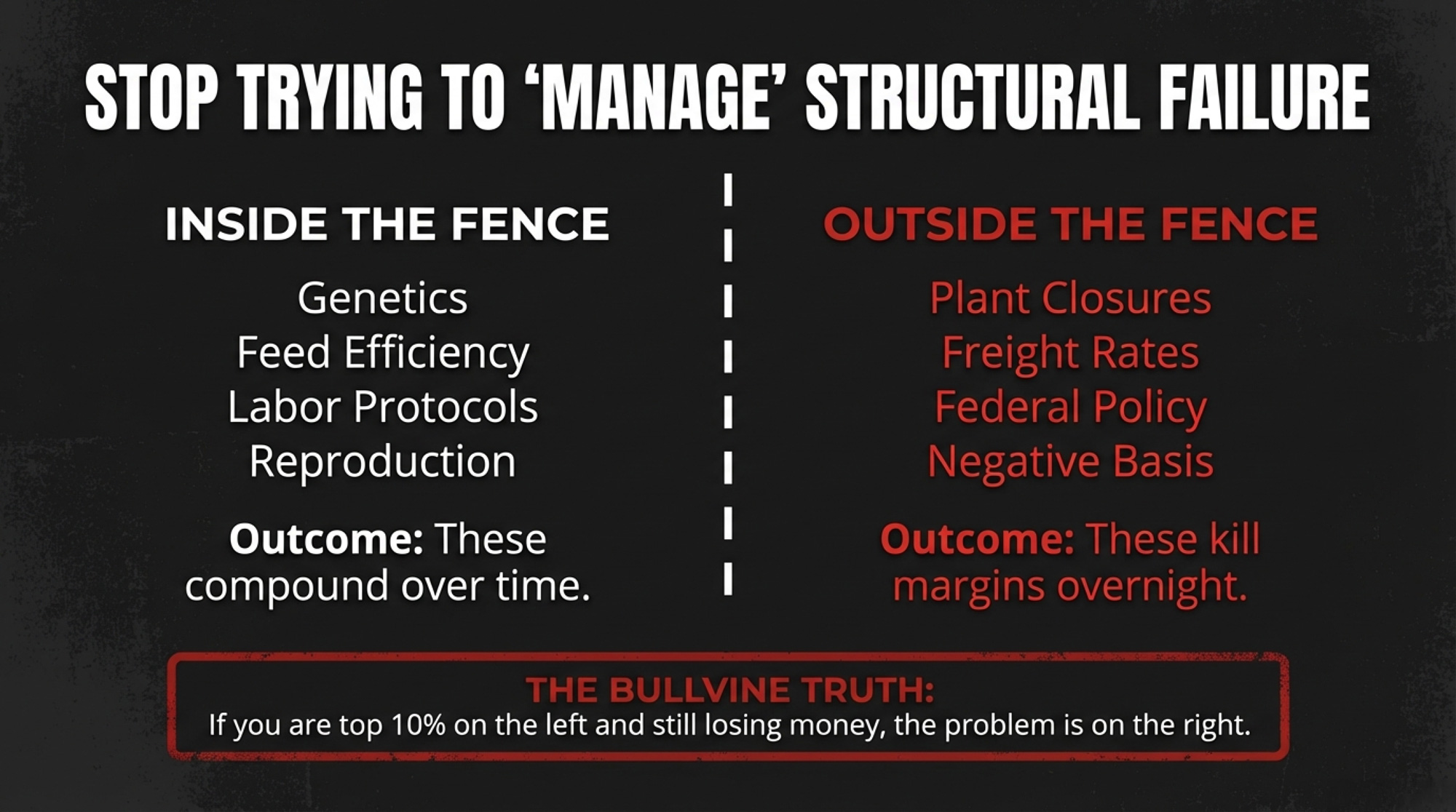 And that brings us to the distinction that matters most in this entire story: inside the fence versus outside the fence.Feed efficiency, reproduction, labor protocols — those live inside the fence, and improving them compounds over time. Basis, plant closures, make‑allowance hikes, route economics — those live outside it. If you’ve become top‑10% at everything inside the fence and your three‑to‑five‑year average still shows red, North Dakota’s lesson is blunt. The problem is structural, not operational. You can’t breed your way to cheaper diesel.
