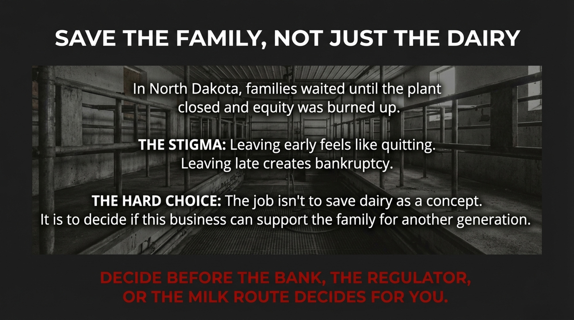 Path 4: Plan a profitable, deliberate exit. If your structural math is negative over a multi‑year average, no successor is committed, and major capital expenditures loom, the most rational move may be to sell cows and equipment while they still command reasonable prices, keep the land, and redeploy capital. In North Dakota, hundreds of families waited until plant closures and exhausted equity forced distressed exits. The families who got out earlier kept more of what they’d built.