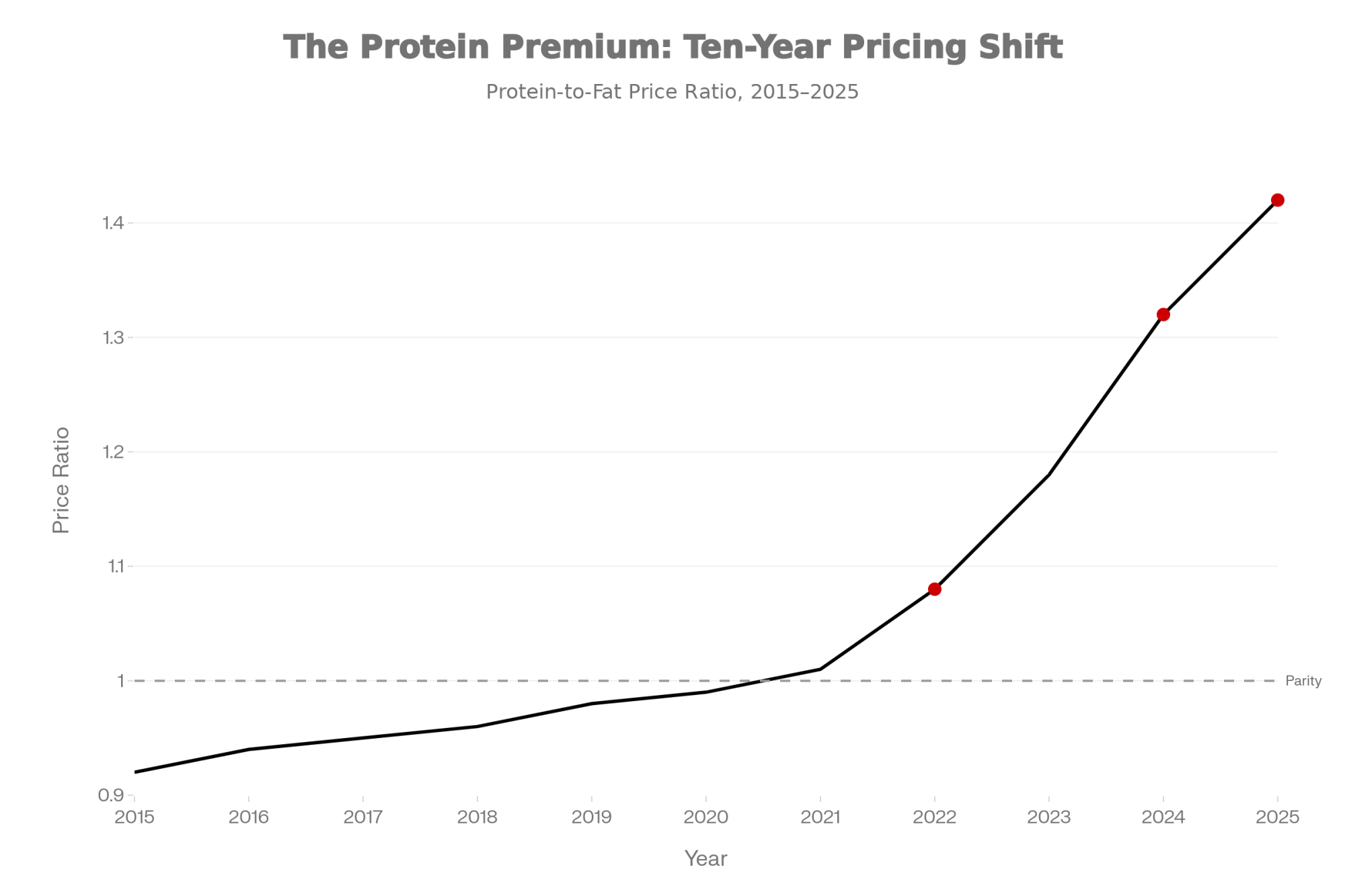My thinking: even if protein premiums moderate, protein is unlikely to become less valuable than fat on a sustained basis. The fundamentals—bioavailability advantages, consumer demand for functional nutrition, processing economics—support continued protein value.